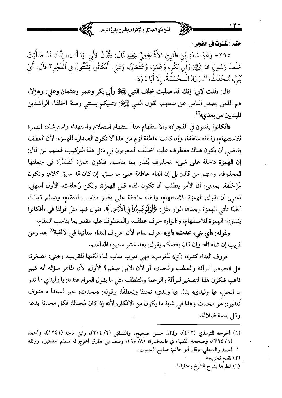 295 - وعن سعد بن طارق الأشجعي رضي الله عنه قال: ((قلت لأبي: يا أبت، إنك قد صليت خلف رسول الله صلى الله عليه وسلم وأبي بكر، وعمر، وعثمان، وعلي، أفكانوا يقنتون في الفجر؟ قال: أي بني، محدث)). رواه الخمسة، إلا أبا داود.