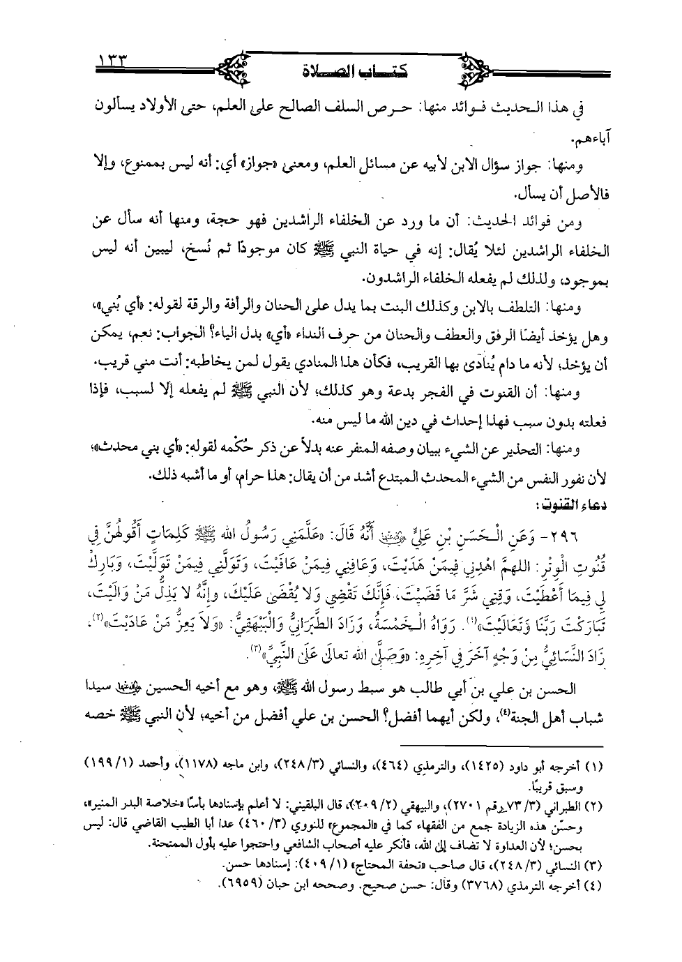 296 - وعن الحسن بن علي رضي الله عنهم أنه قال: ((علمني رسول الله صلى الله عليه وسلم كلمات أقولهن في قنوت الوتر: اللهم أهدني فيمن هديت، وعافني فيمن عافيت، وتولني فيمن توليت، وبارك لي فيما أعطيت، وقني شر ما قضيت، فإنك تقضي ولا يقضى عليك، وإنه لا يذل من واليت، تباركت ربنا وتعاليت)). رواه الخمسة، وزاد الطبراني والبيهقي: ((ولا يعز من عاديت))، زاد النسائي من وجه آخر في آخره: ((وصلى الله تعالى على النبي)).
