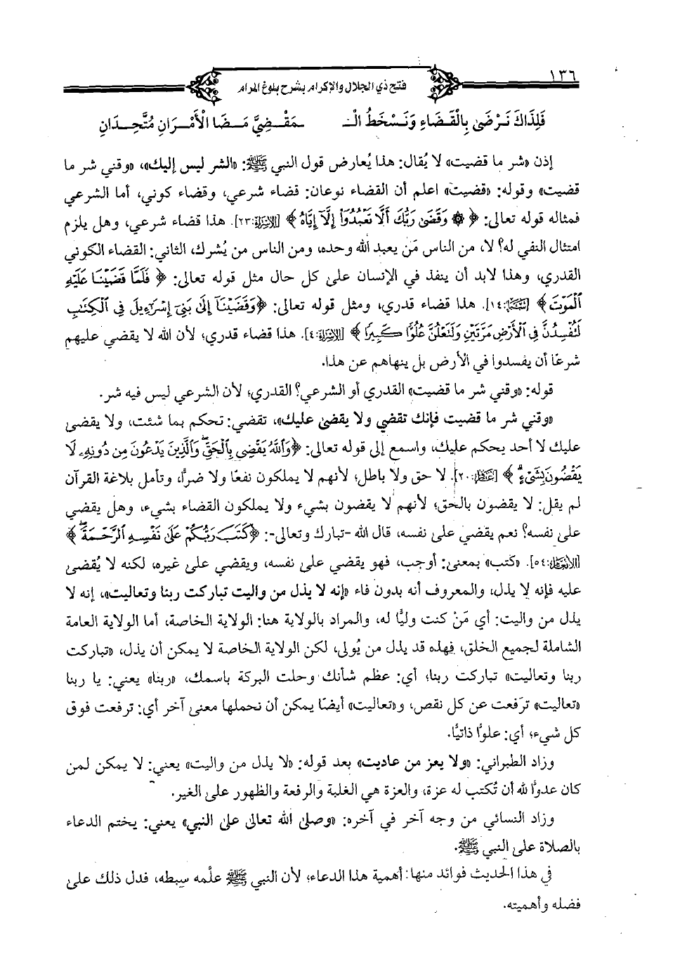 إذن ((شر ما قضيت)) لا يقال: هذا يعارض قول النبي صلى الله عليه وسلم: ((الشر ليس إليك))، ((وقني شر ما قضيت)) وقوله: ((قضيت)) اعلم أن القضاء نوعان: قضاء شرعي، وقضاء كوني، أما الشرعي فمثاله قوله تعالى: {وقضى ربك ألا تعبدوا إلا إياه} [الإسراء: 23].هذا قضاء شرعي، وهل يلزم امتثال النفي له؟ لا، من الناس من يعبد الله وحده، ومن الناس من يشرك، الثاني: القضاء الكوني القدري، وهذا لابد أن ينفذ في الإنسان على كل حال مثل قوله تعالى: {فلما قضينا عليه الموت} [سبأ: 14]. هذا قضاء قدري، ومثل قوله تعالى: {وقضينا إلى بني إسرائيل في الكتاب لتفسدن في الأرض مرتين ولتعلن علوا كبيرا} [الإسراء: 4]. هذا قضاء قدري؛ لأن الله لا يقضي عليهم شرعا أن يفسدوا في الأرض بل ينهاهم عن هذا.
