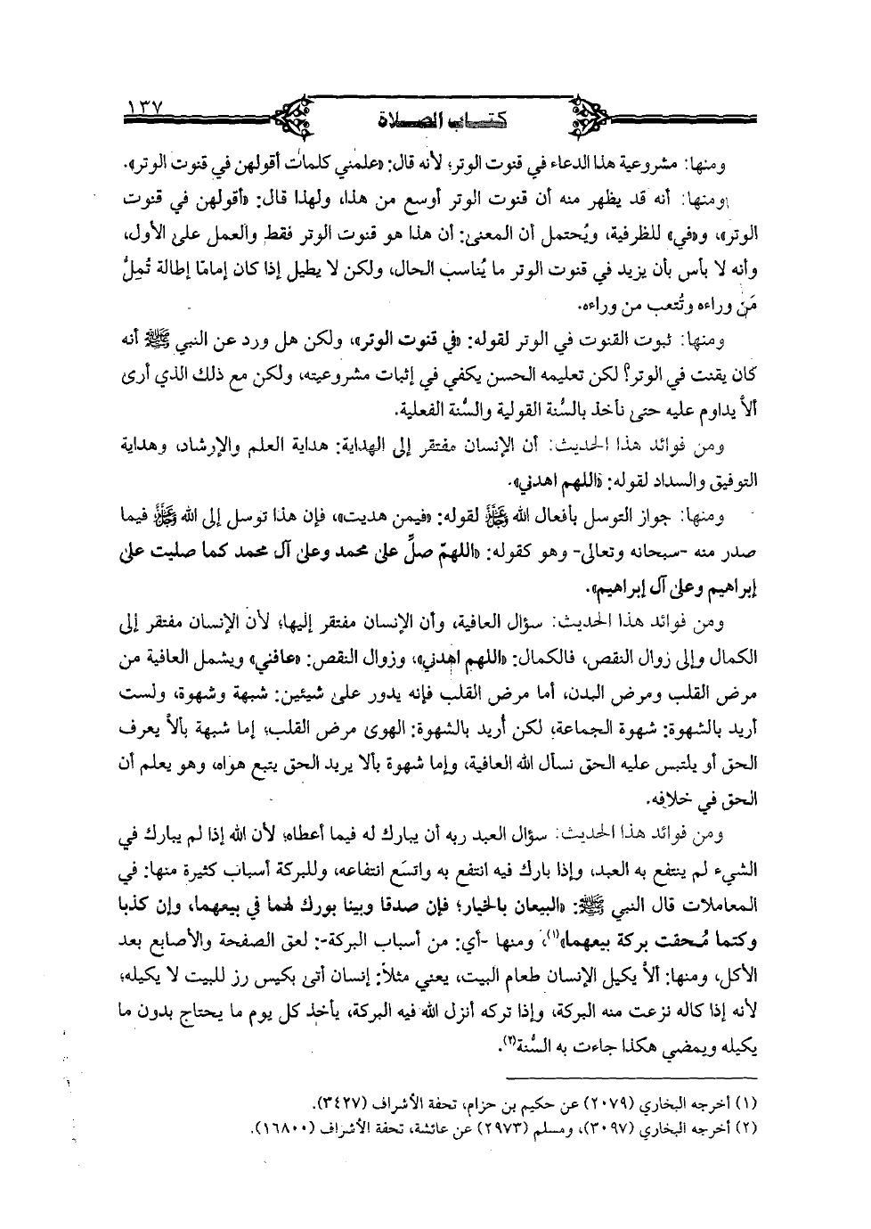 ومنها: مشروعية هذا الدعاء في قنوت الوتر؛ لأن قال: ((علمني كلمات أقولهن في قنوت الوتر)).