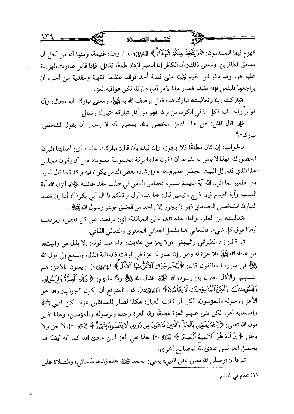 ثم قال: زاد الطبراني والبيهقي ((ولا يعز من عاديت)) هذه ضد قوله: ((لا يذل من واليت)) من عاداه الله عز وجل فلا عزة له وهو وإن صار له عزة في الوقت فالعاقبة الذل، واسمع إلى قول الله عز وجل في سورة المنافقون قال: {ليخرجن الأعز منها الأذل} [المنافقون: 8]. ويعنون بالأعز: هم أنفسهم، والأذل يعنون به: رسول الله صلى الله عليه وسلم، فقال الله عز وجل ردًا عليهم: {ولله العزة وللاسوله وللمؤمنين ولكن المنافقين لا يعلمون} [المنافقون: 8]. كان المتوقع أن يكون الجواب: والله هو الأعز ورسوله والمؤمنون، لكن لو كانت العبارة هكذا لصار للمنافقين عزة، لكن النبي صلى الله عليه وسلم وأصحابه أعز، لكن نفى عنهم العزة مطلقا ولله العزة وحده ولرسوله وللمؤمنين، وهذا نظير قول الله تعالى: {والله يقضي بالحق والذين يدعون من دونه لا يقضون بشيء} [غافر: 20]. لا حق ولا باطل {إن الله هو السميع البصير} [غافر: 20]. هذا نفي العز لمن عادى الله، كما أنه أيضًا قد يحصل العز لمن عادى الله لمصالح أخرى.