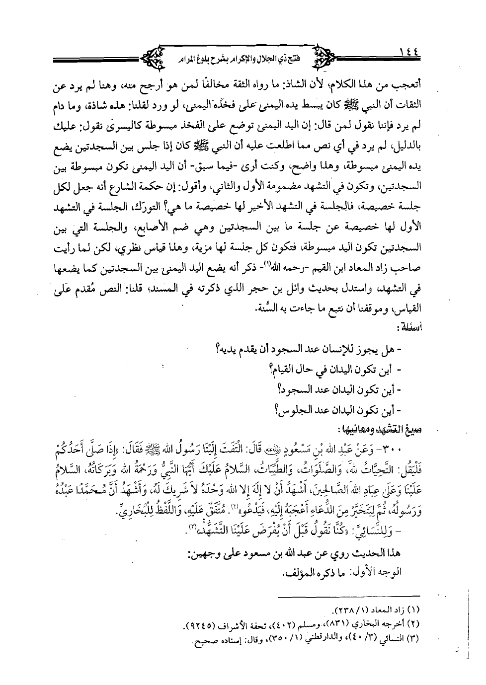 أتعجب من هذا الكلام، لأن الشاذ: ما رواه الثقة مخالفًا لم هو أرجح منه، وهنا لم يرد عن الثقات أن النبي صلى الله عليه وسلم كان يبسط يديه اليمنى على فخذه اليمنى، لو ورد لقلنا: هذه شاذة، وما دام لمن يرد فإننا نقول لمن قال: إن اليد اليمنى توضع على الفخذ مبسوطة كاليسرى نقول: عليك بالدليل، لم يرد في أي نصٍ مما اطلعت عليه أن النبي صلى الله عليه وسلم كان إذا جلس بين السجدتين يضع يده اليمنى مبسوطة، وهذا واضح، وكنت أرى- فيما سبق- أن اليد اليمنى تكون مبسوطة بين السجدتين، وتكون في التشهد مضمومة الأول والثاني، وأقول: إن حكمة الشارع أنه جعل لكل جلسةٍ خصيصة، فالجلسة في التشهد الأخير لها خصيصة ما هي؟ التورك، الجلسة في التشهد الأول لها خصيصة عن جلسة ما بين السجدتين، وهي ضم الأصابع، والجلسة التي بين السجدتين تكون اليد مبسوطة، فتكون كل جلسةٍ لها مزية، وهذا قياس نظري، لكن لما رأيت صاحب زاد المعاد ابن القيم- رحمه الله- ذكر أنه يضع اليد اليمنى بين السجدتين كما يضعها في التشهد، واستدل بحديث وائل بن حجر الذي ذكرته في المسند، قلنا: النص مقدم على القياس، وموقفنا أن نتبع ما جاءت به السنة.