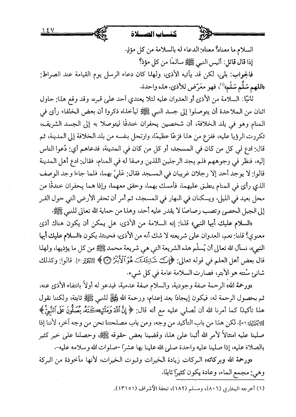 "السلام عليك أيها النبي" قلنا: إنه السلامة من الأذى، هل يمكن أن يكون هناك أذى معنوي؟ قلنا: نعم، العدوان على شريعته لا شك أنه من الأذى، فحينئذٍ يكون "السلام عليك أيها النبي"، نسأل الله تعالى أن يسلم هذه الشريعة التي هي شريعة محمد صلى الله عليه وسلم من كل ما يؤذيها، ولهذا قال بعض أهل العلم في قوله تعالى: {إن شانئك هو الأبتر} [الكوثر: 3]. قالوا: وكذلك شانئ سنته هو الأبتر، فصارت السلامة عامة في كل شيء.
