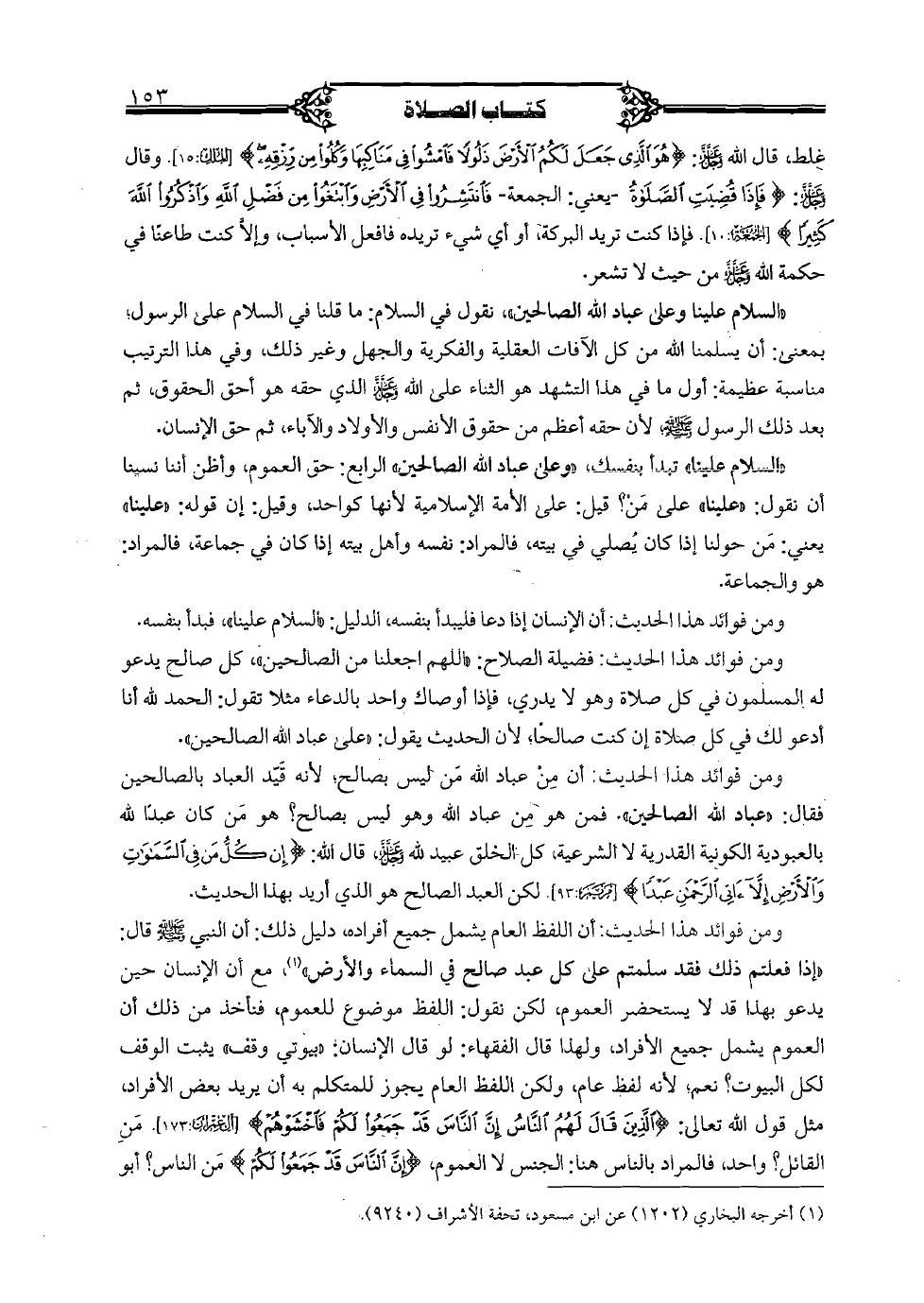 ومن فوائد هذا الحديث: فضيلة الصلاح: "اللهم اجعلنا من الصالحين"، كل صالحٍ يدعو له المسلمون في كل صلاة وهو لا يدري، فإذا أوصاك واحد بالدعاء مثلًا تقول: الحمد لله أنا أدعو لك في كل صلاةٍ إن كنت صالحًا، لأن الحديث يقول: "على عباد الله الصالحين".