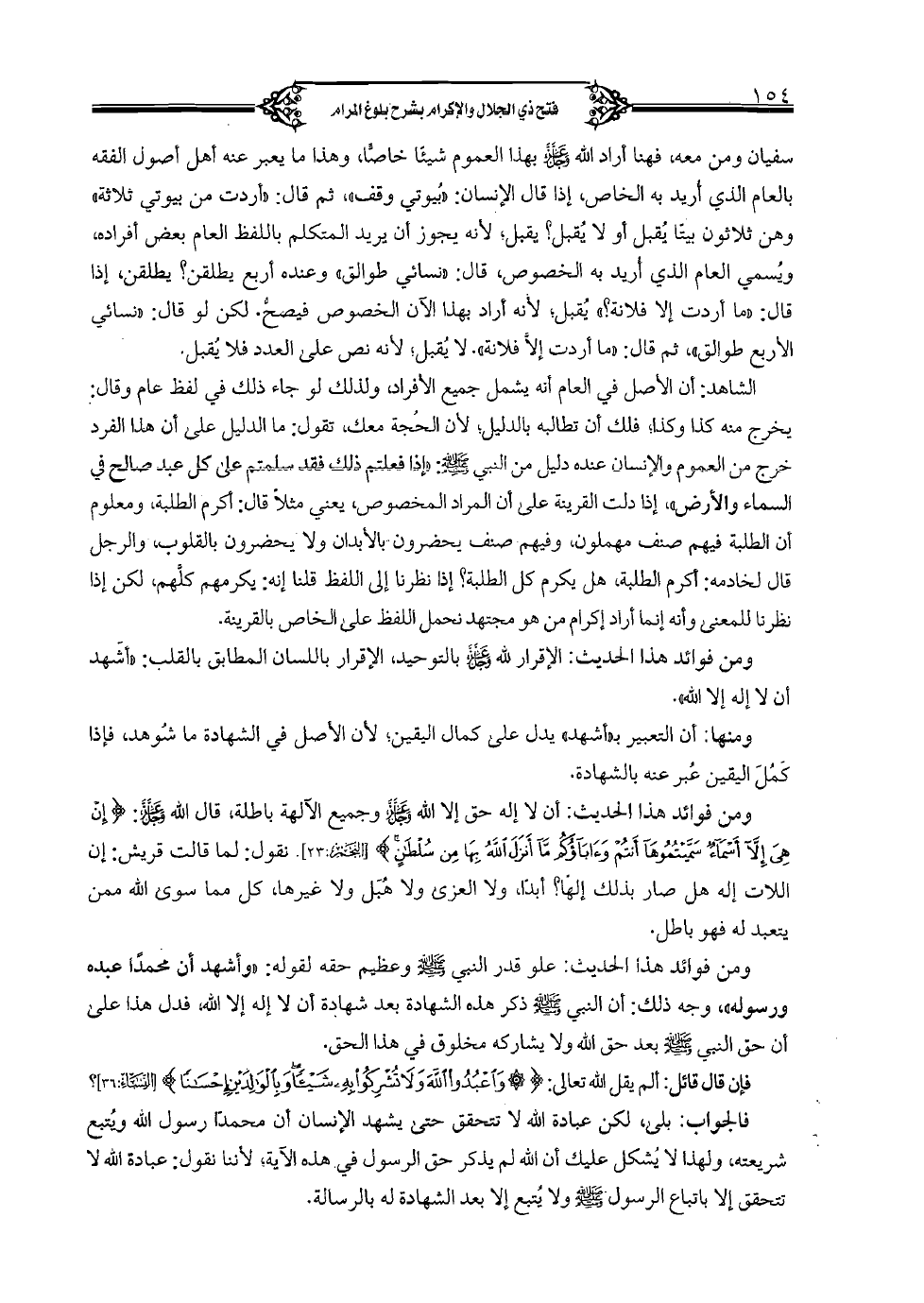 الشاهد: أن الأصل في العام أنه يشمل جميع الأفراد، ولذلك لو جاء ذلك في لفظ عام: وقال: يخرج منه كذا وكذا؛ فلك أن تطالبه بالدليل؛ لأن الحجة معك، تقول: ما الدليل على أن هذا الفرد خرج من العموم والإنسان عنده دليل من النبي صلى الله عليه وسلم: "إذا فعلتم ذلك فقد سلمتم على كل عبدٍ صالحٍ في السماء والأرض"، إذا دلت القرينة على أن المراد المخصوص، يعني مثلًا قال: أكرم الطلبة، ومعلوم أن الطلبة فيهم صنف مهملون، وفيهم صنف يحضرون بالأبدان ولا يحضرون بالقلوب، والرجل قال لخادمه: أكرم الطلبة، هل يكرم كل الطلبة؟ إذا نظرنا إلى اللفظ قلنا إنه: يكرمهم كلهم، لكن إذا نظرنا للمعنى وأنه إنما أراد إكرام من هو مجتهد نحمل اللفظ على الخاص بالقرينة.