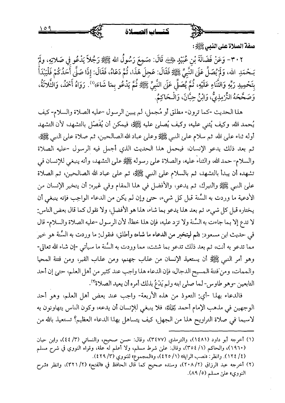 302 - وعن فضالة بن عبيد رضي الله عنه قال: "سمع رسول الله صلى الله عليه وسلم رجلًا يدعو في صلاته، ولم يحمد لله، ولم يصل على النبي صلى الله عليه وسلم فقال: عجل هذا، ثم دعاه، فقال: إذا صلى أحدكم فليبدأ بتحميد ربه والثناء عليه، ثم يصلي على النبي صلى الله عليه وسلم ثم يدعو لما شاء". رواه أحمد، والثلاثة، وصححه الترمذي، وابن حبان، والحاكم.