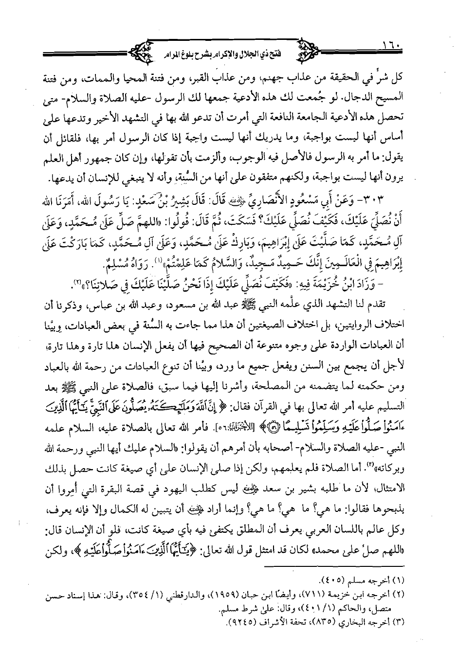 تقدم لنا التشهد الذي علمه النبي صلى الله عليه وسلم بن مسعود، وعبد الله بن عباس، وذكرنا أن اختلاف الروايتين، بل اختلاف الصيغتين أن هذا مما جاءت به السنة في بعض العبادات، وبينا أن العبادات الواردة على وجوهٍ متنوعةٍ أن الصحيح فيها أن يفعل الإنسان هذا تارةً وهذا تارةً، لأجل أن يجمع بين السنن ويفعل جميع ما ورد، وبينا أن تنوع العبادات من رحمة الله بالعباد ومن حكمته لم يتضمنه من المصلحة، وأشرنا إليها فيما سبق، فالصلاة على النبي صلى الله عليه وسلم بعد التسليم عليه أمر الله تعالى بها في القرآن فقال: {إن الله وملائكته يصلون على النبي يا أيها الذين آمنوا صلوا عليه وسلموا تسليمًا} [الأحزاب: 56]. فأمر الله تعالى بالصلاة عليه، السلام علمه النبي- عليه الصلاة والسلام- أصحابه بأن أمرهم أن يقولوا: "السلام عليك أيها النبي ورحمة الله وبركاته". أما الصلاة فلم يعلمهم، ولكن إذا صلى الإنسان على أي صيغةٍ كانت حصل بذلك الامتثال، لأن ما طلبه بشير بن سعد رضي الله عنه ليس كطلب اليهود في قصة البقرة التي أمروا أن يذبحوها فقالوا: ما هي؟ ما هي؟ ما هي؟ وإنما أراد رضي الله عنه أن يتبين له الكمال وإلا فإنه يعرف، وكل عالمٍ باللسان العربي يعرف أن المطلق يكتفى فيه بأي صيغةٍ كانت، فلو أن الإنسان قال: "اللهم صل على محمد" لكان قد امتثل قول الله تعالى: {يا أيها الذين آمنوا صلوا عليه}، ولكن