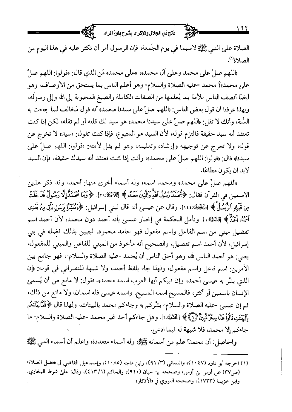 "اللهم صل على محمد" ومحمد اسمه، وله أسماء أخرى منها: أحمد، وقد ذكر هذين الاسمين في القرآن فقال: {محمد رسول الله والذين معه} [الفتح: 29]. {وما محمد إلا رسول قد خلت من قبله الرسل} [آل عمران: 144]. وقال عن عيسى أنه قال لبني إسرائيل: {ومبشرًا برسولٍ يأتي من بعدي اسمه أحمد} [الصف: 6]. وتأمل الحكمة في إخبار عيسى بأنه أحمد دون محمد، لأن أحمد اسم تفضيلٍ مبني من اسم الفاعل واسم مفعولٍ فهو حامد محمود، ليتبين بذلك فضله في بني إسرائيل؛ لأن أحمد اسم تفضيل، والصحيح أنه مأخوذ من المبني للفاعل والمبني للمفعول، يعني: هو أحمد الناس لله، وهو أحق الناس أن يحمد- عليه الصلاة والسلام-، فهو جامع بين الأمرين: اسم فاعلٍ واسم مفعول، ولهذا جاء بلفظ أحمد، ولا شبهة للنصراني في قوله: "إن الذي بشر به عيسى أحمد، وإن نبيكم أيها العرب اسمه محمد". نقول: لا مانع من أن يسمى الإنسان باسمين أو أكثر، فالمسيح اسمه المسيح، واسمه عيسى فله اسمان، ولا مانع من ذلك، ثم إن عيسى- عليه الصلاة والسلام- بشركم به، وجاءكم محمد بالبينات، ولهذا قال {فلما جاءهم بالبينات قالوا هذا سحر مبين} [الصف: 6]. وهل جاءكم أحد غير محمد- عليه الصلاة والسلام- ما جاءكم إلا محمد، فلا شبهة له فيما ادعى.