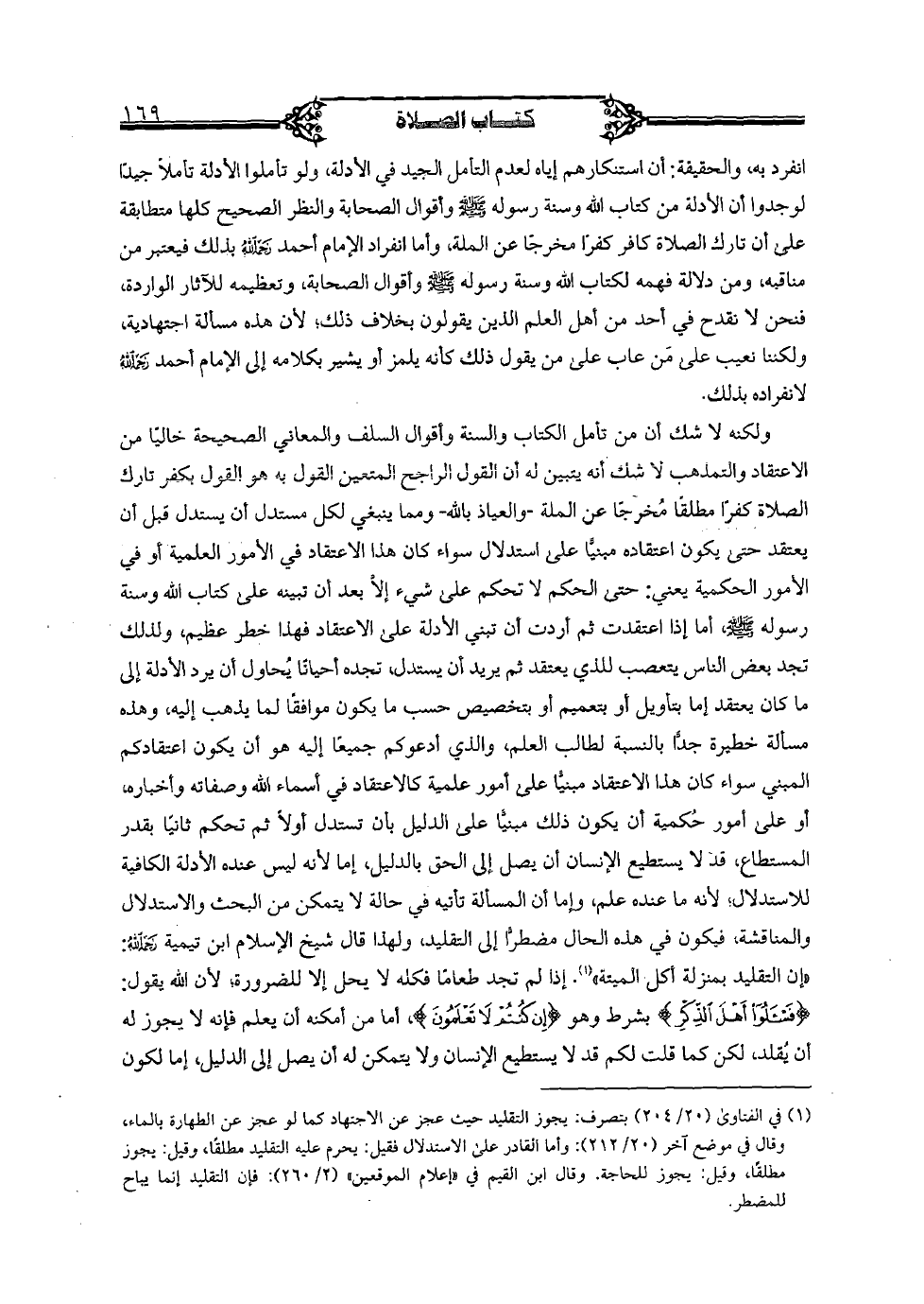 ولكنه لا شك أن من تأمل الكتاب والسنة وأقوال السلف والمعاني الصحيحة خاليًا من الاعتقاد والتمذهب لا شك أنه يتبين له، أن القول الراجح المتعين به هو القول بكفر تارك الصلاة كفرًا مطلقًا مخرجًا عن الملة- والعياذ بالله- ومما ينبغي لكل مستدلٍ أن يستدل قبل أن يعتقد حتى يكون اعتقاده مبنيًا على استدلالٍ سواءً كان هذا الاعتقاد في الأمور العلمية أو في الأمور الحكمية يعني: حتى الحكم لا تحكم على شيءٍ إلا بعد أن تبنيه على كتاب الله وسنة رسوله صلى الله عليه وسلم، أما إذا اعتقدت ثم أردت أن تبني الأدلة على الاعتقاد فهذا خطر عظيم، ولذلك تجد بعض الناس يتعصب للذي يعتقد ثم يريد أن يستدل، تجده أحيانًا يحاول أن يرد الأدلة إلى ما كان يعتقد إما بتأويلٍ أو بتعميمٍ أو بتخصيصٍ حسب ما بكون موافقًا لما يذهب إليه، وهذه مسألة خطيرة جدًا بالنسبة لطالب العلم، والذي أدعوكم جميعًا إليه هوأان يكون اعتقادكم المبني سواء كان هذا الاعتقاد مبنيًا على أمورٍ علميةٍ كالاعتقاد في أسماء الله وصفاته وأخباره، أو على أمورٍ حكمية أن يكون ذبك مبنيًا على الدليل بأن تستدل أولًا ثم تحكم ثانيًا بقدر المستطاع، قد لا يستطيع الإنسان أن يصل إلى الحق بالدليل، إما لأنه ليس عنده الأدلة الكافية للاستدلال؛ أنه ما عنده علم، وإما أن المسألة تأتيه في حالةٍ لا يتمكن من البحث والاستدلال والمناقشة، فيكون في هذه الحال مضطرًا إلى التقليد، ولهذا قال شيخ الإسلام ابن تيمية رحمه الله: "إن التقليد بمنزلة أكل الميتة". إذا لم تجد طعامًا فكله لا يحل إلى للضرورة، لأن الله يقول: {فاسألوا أهل الذكر} بشرطٍ وهو {إن كنتم لا تعلمون}، أما من أمكنه أن يعلم فإنه لا يجوز له أن يقلد، لكن كما قلت لكم قد لا يستطيع الإنسان ولا يتمكن له أن يصل إلى الدليل، إما لكون