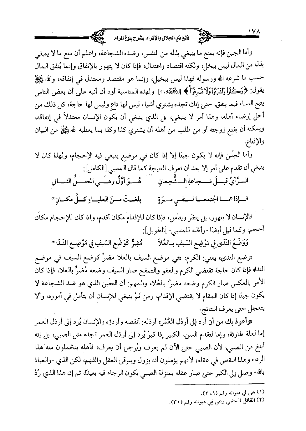 "وضع الندى" يعني: الكرم، "في موضع السيف بالعلا مضر كوضع السيف في موضع الندا" فإذا كان حاجة تقتضي الكلام والعفو والصفح صار السيف وضعه مضر بالعلا، فإذا كان الأمر بالعكس صار الكرم وضعه مضرًا بالعلا، فإذا كان الأمر بالعكس صار الكلام وضعه مضرًا بالعلاـ والمهم: أن الجبن الذي هو ضد الشجاعة لا يكون جبنًا إذا كان المقام لا يقتضي الإقدام، ومن ثم ينبغي للإنسان أن يتأمل في أموره، وألا يتعجل حتى يعرف النتائج.