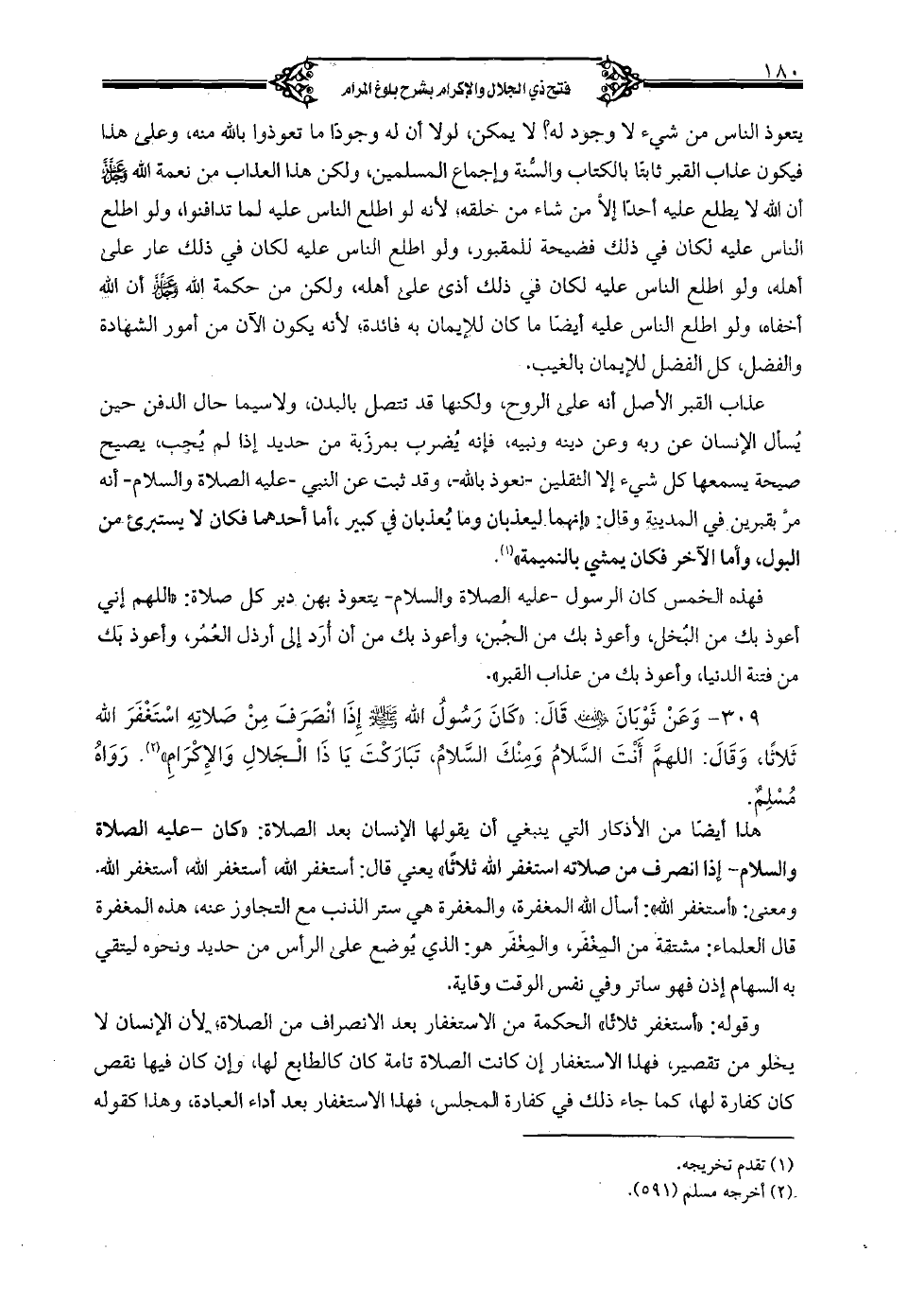 309 - وعن ثوبان رضي الله عنه قال: "كان رسول الله صلى الله عليه وسلم إذا انصرف من صلاته استغفر الله ثلاثًا، وقال: اللهم أنت السلام ومنك السلام، تباركت يا ذا الجلال والإكرام". رواه مسلم.