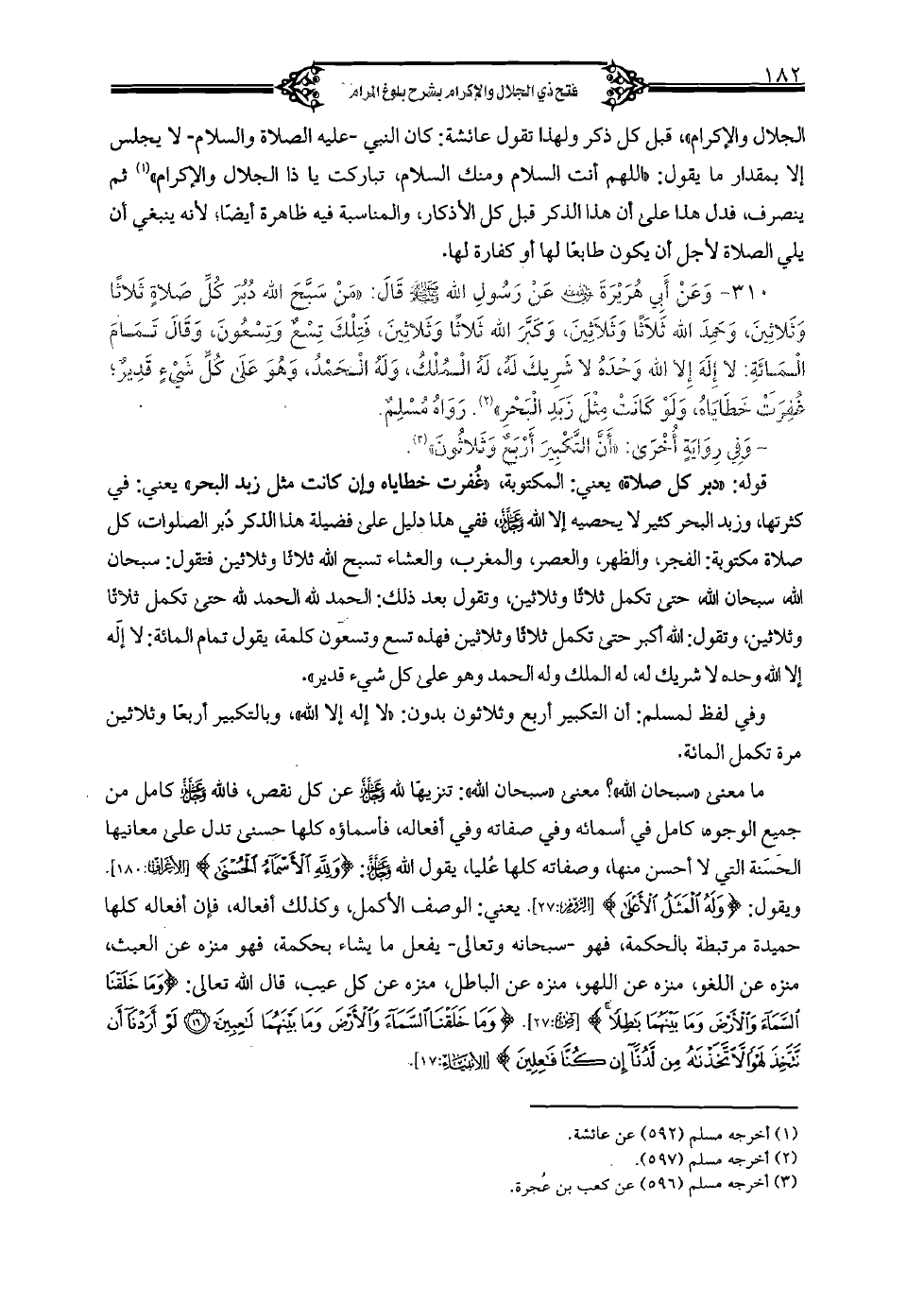 310 - وعن أبي هريرة رضي الله عنه عن رسول الله صلى الله عليه وسلم قال: "من سبح الله دبر كل صلاةٍ ثلاثًا وثلاثين، وحمد لله ثلاثًا وثلاثين، وكبر الله ثلاثًا وثلاثين، فتلك تسع وتسعون، وقال تمام المائة: لا إله إلا الله وحده لا شريك له، له الملك، وله الحمد، وهو على كل شيءٍ قدير، غفرت خطاياه، ولو كنت مثل زبد البحر". رواه مسلم.