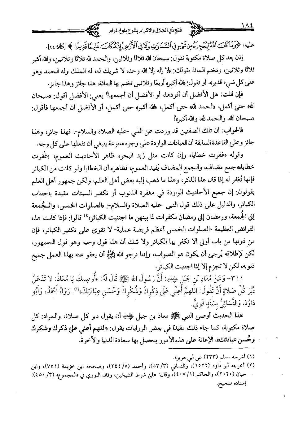 هذا الحديث أوصى النبي صلى الله عليه وسلم معاذ بن جبل رضي الله عنه أن يقول دبر كل صلاة، والمراد: كل صلاةٍ مكتوبة، كما جاء ذلك مقيدًا في بعض الروايات يقول: "اللهم أعني على ذكرك وشكرك وحسن عبادتك"، الإعانة على هذه الأمور يحصل بها سعادة الدنيا والآخرة.