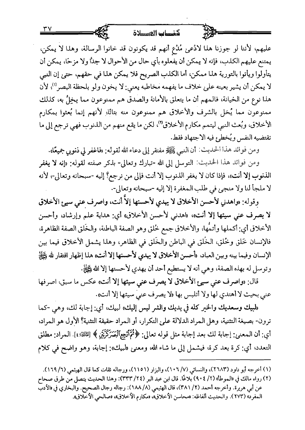 وقوله: "واهدني لأحسن الأخلاق لا يهدي لأحسنها إلا أنت، واصرف عني سيئ الأخلاق لا يصرف عني سيئها إلا أنت"، "اهدني لأحسن الأخلاق" أي: هداية علم وإرشاد، وأحسن الأخلاق أي: أكملها وأتمها، والأخلاق جميع خلق وهو الصفة الباطنة، والخَلق الصفة الظاهرة، فالإنسان خَلق وخُلق، الخُلق في الباطن والخَلق في الظاهر، وهذا يشمل الأخلاق فيما بين الإنسان وفيما بينه وبين العباد، "أحسن الأخلاق لا يهدي لأحسنها إلا أنت" هذا إظهار افتقار لله (عز وجل) وتوسل له بهذه الصفة، وهي أنه لا يستطيع أحد أن يهدي لأحسنها إلا الله (عز وجل).