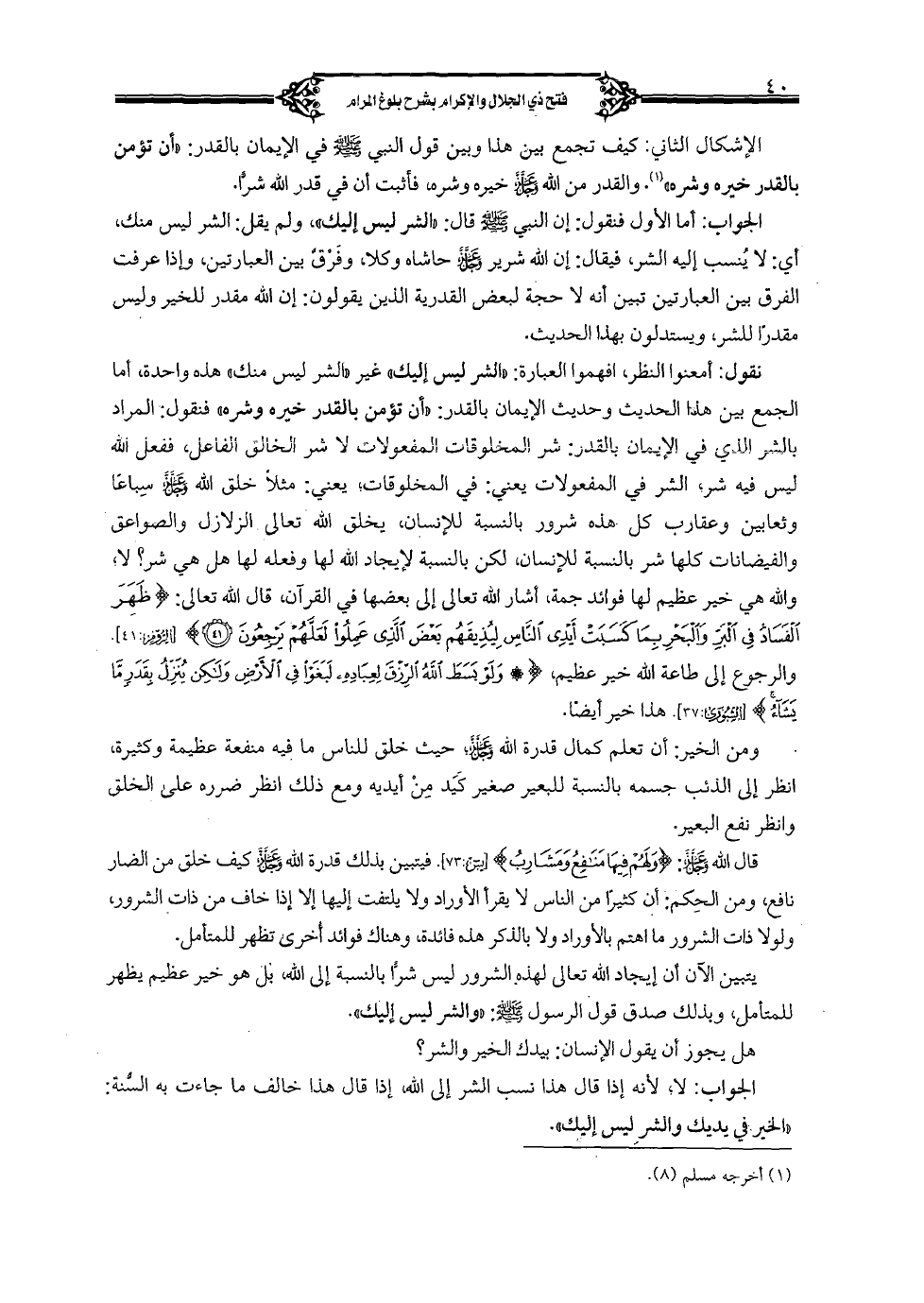 نقول: أمعنوا النظر، افهموا العبارة: "الشر ليس إليك" غير "الشر ليس منك" هذه واحدة، أما الجمع بين هذا الحديث وحديث الإيمان بالقدر: "أن تؤمن بالقدر خيره وشره" فنقول: المراد بالشر الذي في الإيمان بالقدر: شر المخلوقات المفعولات لا شر الخالق الفاعل، ففعل الله ليس فيه شر؛ الشر في المفعولات يعني: في المخلوقات؛ يعني: مثلًا خلق الله (عز وجل) سِباعًا وثعابين وعقارب كل هذه شرور بالنسبة للإنسان، يخلق الله تعالى الزلازل والصواعق والفيضانات كلها شر بالنسبة للإنسان، لكن بالنسبة لإيجاد الله لها وفعله لها هل هي شر؟ لا؛ والله هي خير عظيم لها فوائد جمة، أشار الله تعالى إلى بعضها في القرآن، قال الله تعالى: {ظهر الفساد في البر والبحر بما كسبت أيدي الناس ليذيقهم بعض الذي عملوا لعلهم يرجعون} [الروم: 41].