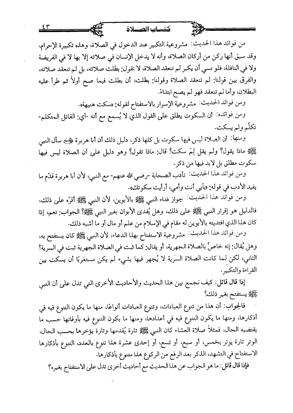 ومنها: أن الصلاة ليس فيها سكوت بل كلها ذكر، دليل ذلك أن أبا هريرة- رضي الله عنه- سأل النبي- صلى الله عليه وسلم- ماذا يقول؟ ولم يقل لِمَ سكت؟ قال: ماذا تقول؟ وهو دليل على أن الصلاة ليس فيها سكوت مطلق بل لابد فيها من ذكر.