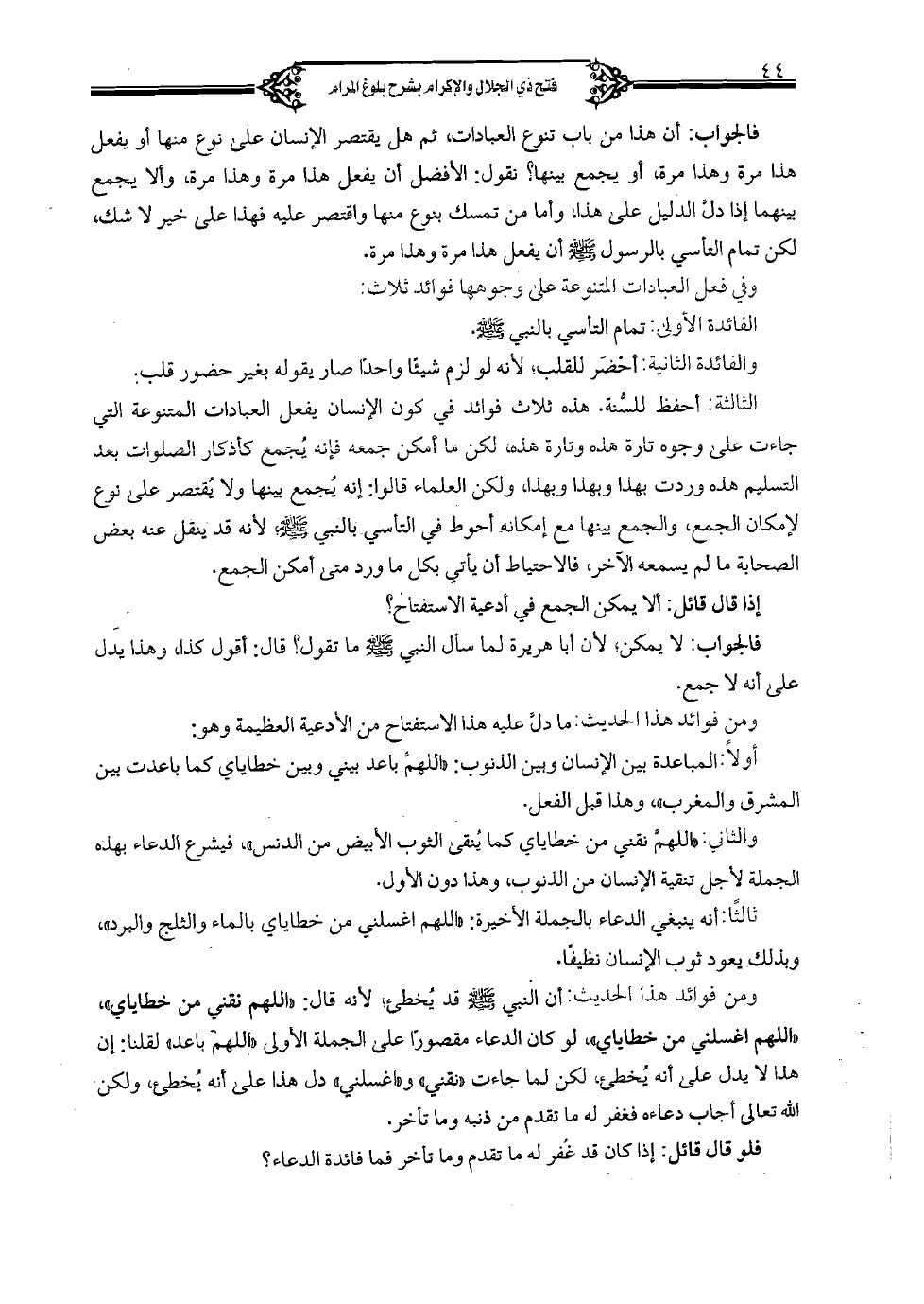 ومن فوائد هذا الحديث: أن النبي- صلى الله عليه وسلم- قد يُخطئ؛ لأنه قال: "اللهم نقني من خطاياي"، "اللهم اغسلني من خطاياي"، لو كان الدعاء مقصورًا على الجملة الأولى "اللهم باعد" لقلنا: إن هذا لا يدل على أنه يُخطئ، لكن لما جاءت "نقني" و"اغسلني" دل هذا على أنه يُخطئ، ولكن الله تعالى أجاب دعاءه فغفر له ما تقدم من ذنبه وما تأخر.