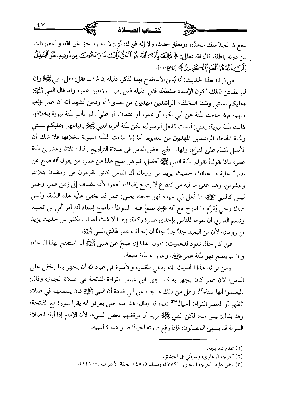ومن فوائد هذا الحديث: أنه ينبغي للقدوة والأسوة في عباد الله أن يجهر بما يخفى على الناس؛ لأن عمر كان يجهر به كما جهر ابن عباس بقراءة الفاتحة في صلاة الجنازة وقال: "ليعلموا أنها سنة"، وهل من ذلك ما جاء عن أبي قتادة أن النبي- صلى الله عليه وسلم- كان يسمعهم في صلاة الظهر أو العصر القراءة أحيانًا؟ نعم، قد يقال: هذا منه حتى يعرفوا أنه يقرأ سورة مع الفاتحة، وقد يقال: ليس منه، لكن النبي- صلى الله عليه وسلم- يريد أن يوقظهم بعض الشيء؛ لأن الإمام إذا أراد الصلاة السرية قد يسهى المصلون، فإذا رفع صوته أحيانًا صار هذا كالتنبيه.
