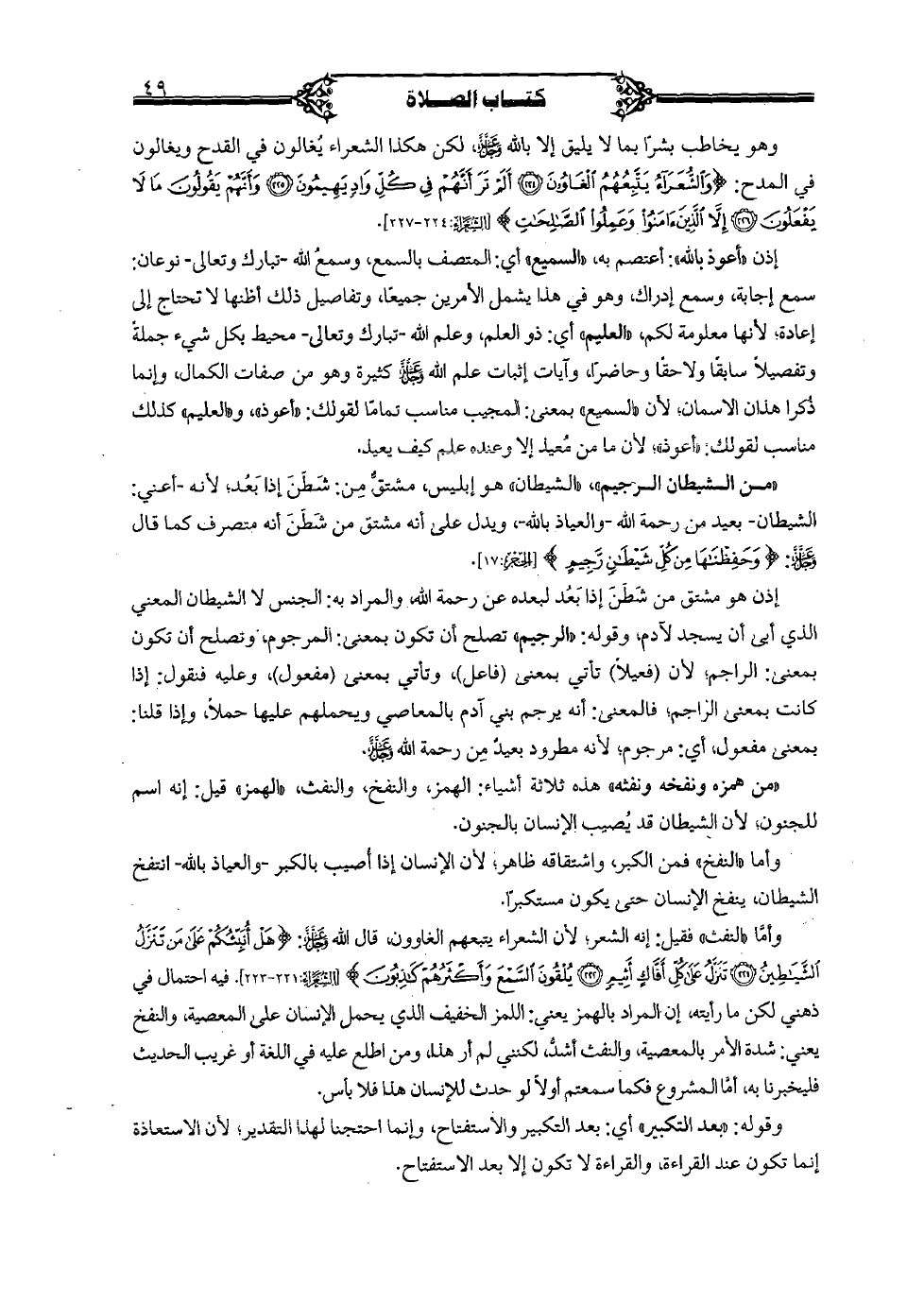 وأما "النفث" فقيل: إنه الشعر؛ لأن الشعراء يتبعهم الغاوون، قال الله- عز وجل-: {هل أنبئكم على من تنزل الشياطين * تنزل على كل أفاك أثيم * يلقون السمع وأكثرهم كاذبون} [الشعراء: 221 - 223] فيه احتمال في ذهني لكن ما رأيته، إن المراد بالهمز يعني: اللمز الخفيف الذي يحمل الإنسان على المعصية، والنفخ يعني: شدة الأمر بالمعصية، والنفث أشدُّ، لكنني لم أر هذا، ومن اطلع عليه في اللغة أو غريب الحديث فليخبرنا به، أما المشروع فكما سمعتم أولًا لو حدث للإنسان هذا فلا بأس.