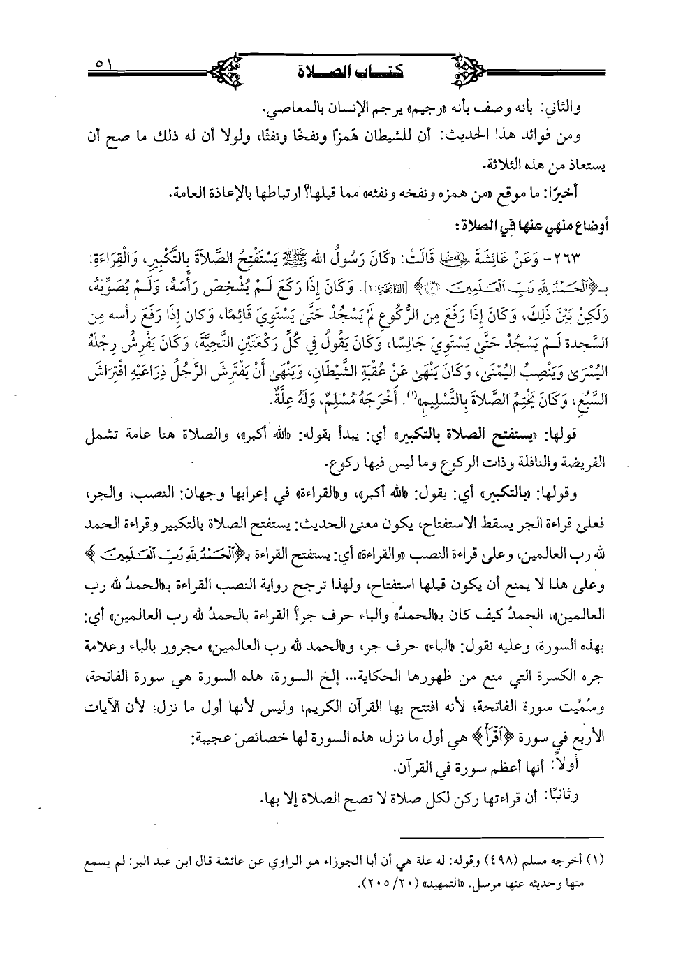 263 - وعن عائشة- رضي الله عنها- قالت: "كان رسول الله- صلى الله عليه وسلم- يستفتح الصلاة بالتكبير، والقراءة: بـ {الحمد لله رب العالمين} [الفاتحة: 2]. وما كان إذا ركع لم يشخص رأسه، ولم يصوبه ولكن بين ذلك، وكان إذا رفع من الركوع لم يسجد حتى يستوي قائمًا، وكان إذا رفع رأسه من السجدة لم يسجد حتى يستوي جالسًا، وكان يقول في كل ركعتين التحية، وكان يفرش رجله اليسرى وينصب اليمنى، وكان ينهى عن عقبة الشيطان، وينهى أن يفترش الرجل ذراعيه افتراش السبع، وكان يختم الصلاة بالتسليم". أخرجه مسلم وله علة.
