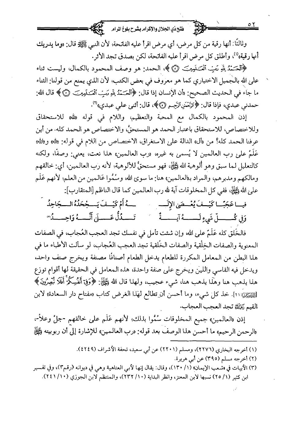 إذن المحمود بالكمال مع المحبة والتعظيم، واللام في قوله "لله" للاستحقاق وللاختصاص، للاستحقاق باعتبار الحمد هو المستحق، والاختصاص هو الحمد كله. من أين عرفنا الحمد كله؟ من "أل" الدالة على الاستغراق، الاختصاص من اللام في قوله: "لله" و"الله" عَلَمٌ على رب العالمين لا يُسمى به غيره، "رب العالمين" هذا نعت، يعني: وصفًا، ولكنه كالتعليل لما سبق وهو ألوهية الله- عز وجل- فهو مستحقٌّ للألوهية؛ لأنه رب العالمين، أي: خالقهم ومالكهم ومدبرهم، والمراد بـ "العالمين" هنا: ما سوى الله، وسُمُّوا عالمين من العلم، لأنهم عَلم على الله- عز وجل- ففي كل المخلوقات آية لله رب العالمين كما قال الناظم [المتقارب]: