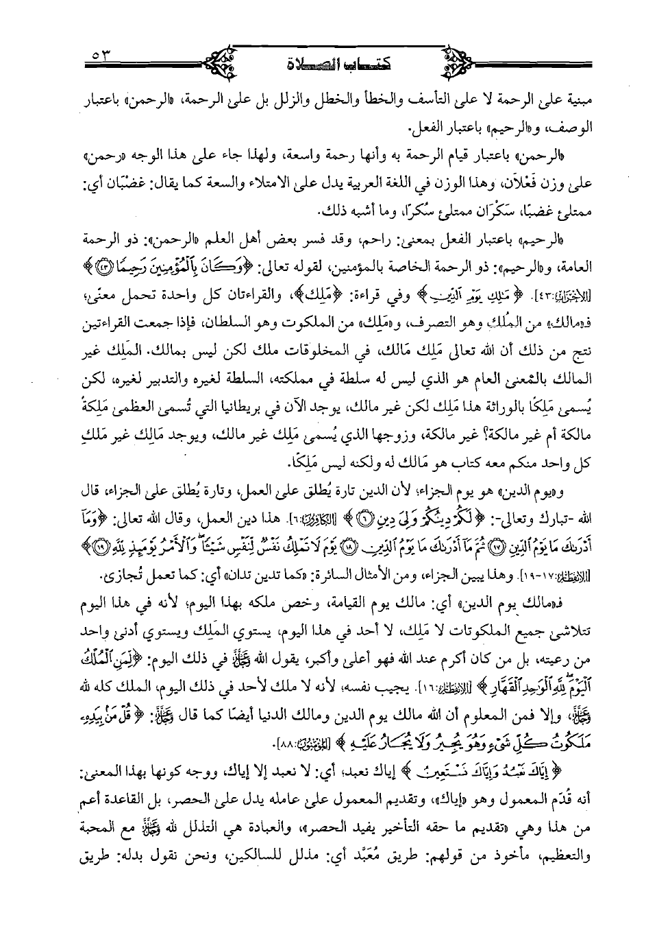 "الرحيم" باعتبار الفعل بمعنى: راحم، وقد فسر بعض أهل العلم "الرحمن": ذو الرحمة العامة، و"الرحيم": ذو الرحمة الخاصة بالمؤمنين، لقوله تعالى: {وكان بالمؤمنين رحيمًا} [الأحزاب: 43]. {مالك يوم الدين} وفي قراءة: {ملك} والقراءتان كل واحدة تحمل معنًى؛ فـ "مالك" من المُلك وهو التصرف، و "مَلِك" من الملكوت وهو السلطان، فإذا جمعت القراءتين نتج من ذلك أن الله تعالى مَلِك مالك، في المخلوقات ملك لكن ليس بمالك. الملك غير المالك بالمعنى العام هو الذي ليس له سلطة في مملكته، السلطة لغيره والتدبير لغيره، لكن يُسمى مَلِكًا بالوراثة هذا مَلِك لكن غير مالك، يوجد الآن في بريطانيا التي تُسمى العظمة ملكةٌ مالكة أم غير مالكة؟ غير مالكة، وزوجها الذي يسمى ملك غير مالك، ويوجد مالك غير ملك كل واحد منكم معه كتاب هو مالك له ولكنه ليس مَلِكًا.