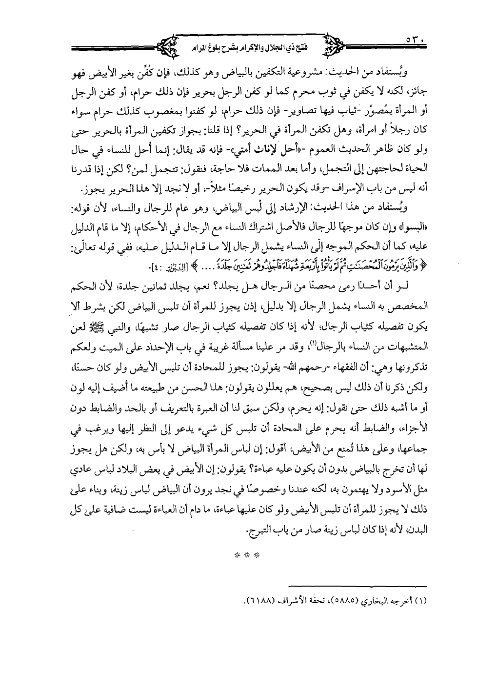 ويستفاد من الحديث: مشروعية التكفين بالبياض وهو كذلك، فإن كفِّن بغير الأبيض فهو جائز، لكنه لا يكفن في ثوب محرم كما لو كفن الرجل بحرير فإن ذلك حرام، أو كفن الرجل أو المرأة بمصوَّر- ثياب فيها تصاوير- فإن ذلك حرام، لو كفنوا بمغصوب كذلك حرام سواء كان رجلًا أو امرأة، وهل تكفن المرأة في الحرير؟ إذا قلنا: بجواز تكفين المرأة بالحرير حتى ولو كان ظاهر الحديث العموم- ((أحل لإناث أمتي)) - فإنه قد يقال: إنما أحل للنساء في حال الحياة لحاجتهن إلى التجمل، وأما بعد الممات فلا حاجة، فنقول: تتجمل لمن؟ لكن إذا قدرنا أنه ليس من باب الإسراف- وقد يكون الحرير رخيصًا مثلًا-، أو لا نجد إلا هذا الحرير يجوز.