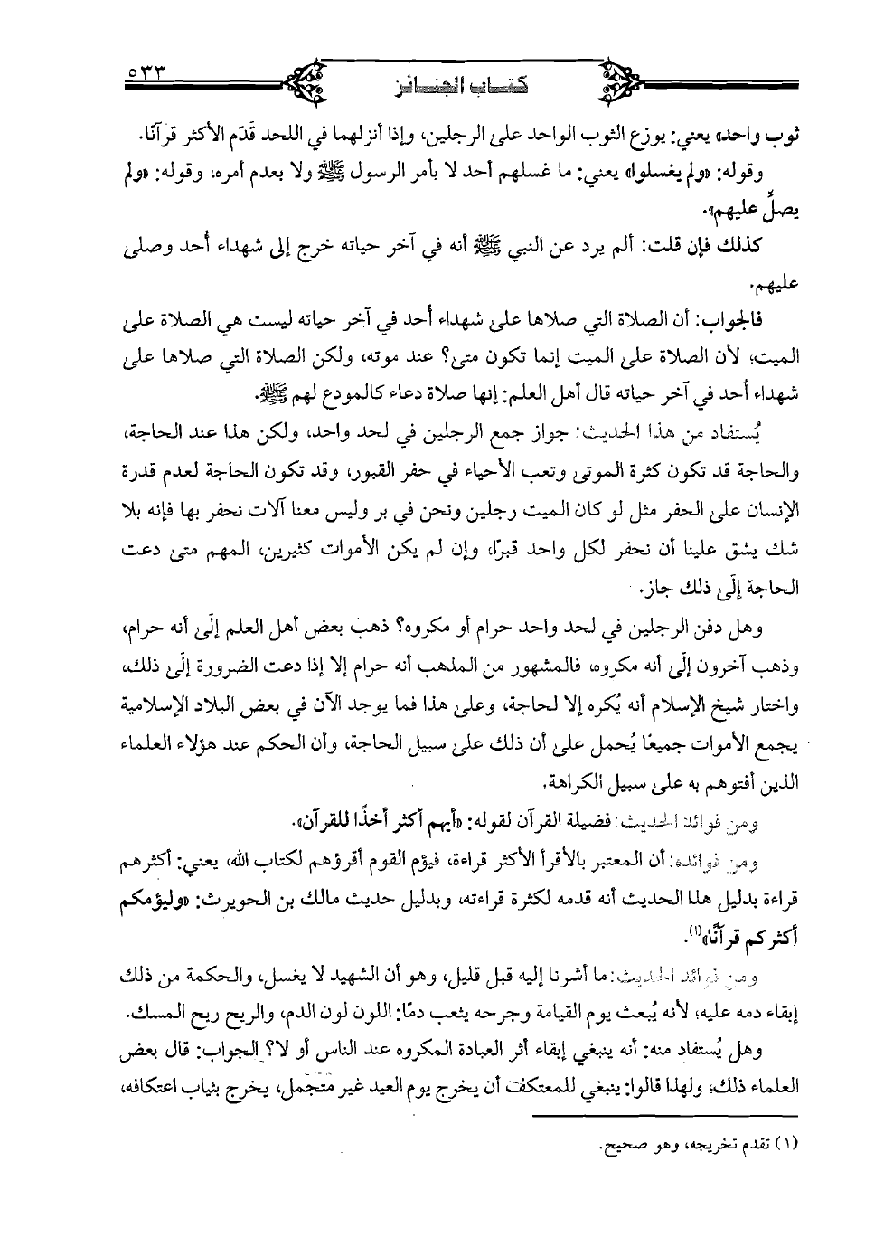 يستفاد من هذا الحديث: جواز جمع الرجلين في لحد واحد، ولكن هذا عند الحاجة، والحاجة قد تكون كثرة الموتى وتعب الأحياء في حفر القبور، وقد تكون الحاجة لعدم قدرة الإنسان على الحفر مثل لو كان الميت رجلين ونحن في بر وليس معنا آلات نحفر بها فإنه بلا شك يشق علينا أن نحفر لكل واحد قبرًا، وإن لم يكن الأموات كثيرين، المهم متى دعت الحاجة إلى ذلك جاز.