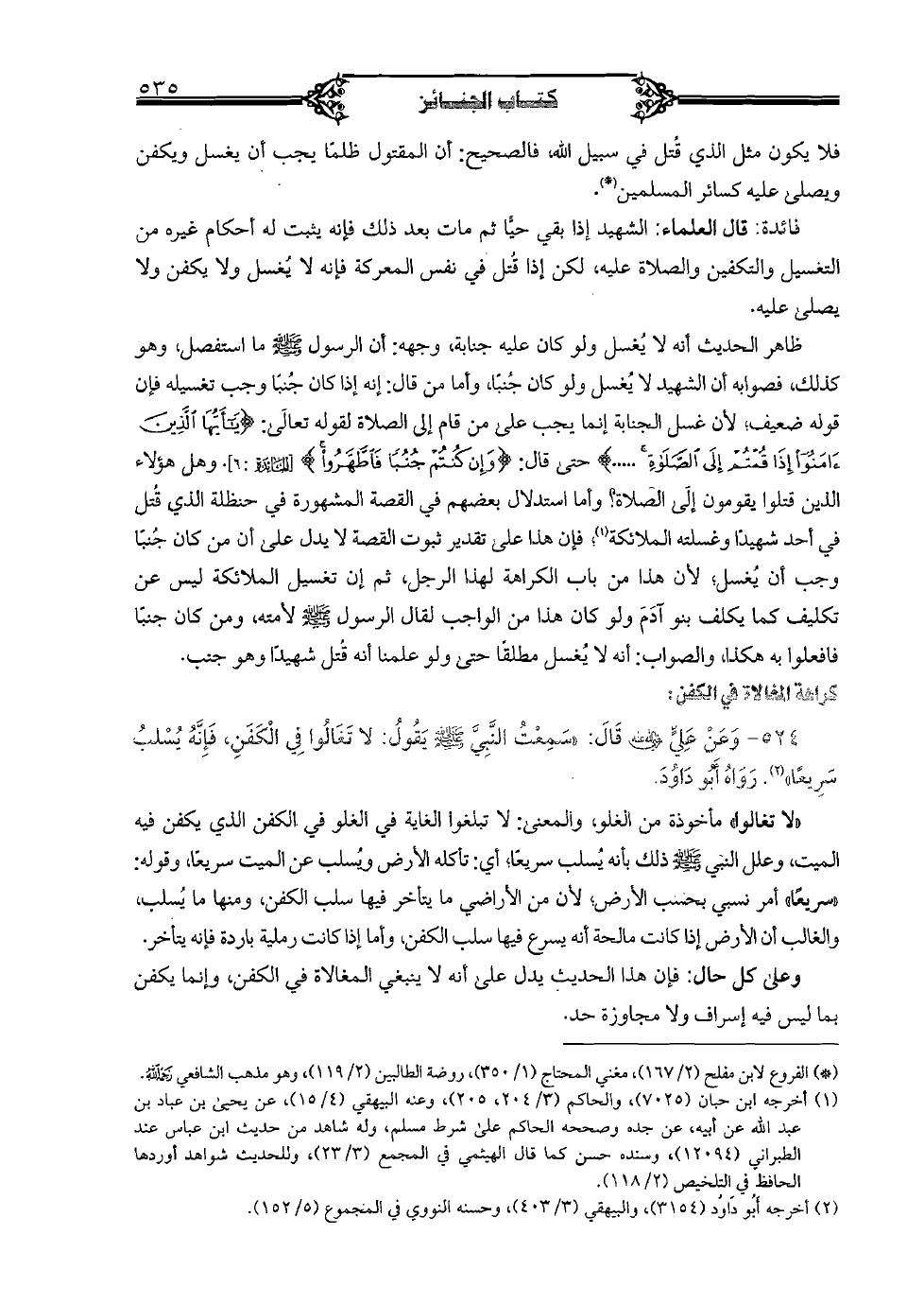 ((لا تغالوا)) مأخوذة من الغلو، والمعنى: لا تبلغوا الغاية في الغلو في الكفن الذي يكفن فيه الميت، وعلل النبي صلى الله عليه وسلم ذلك بأنه يسلب سريعًا؛ أي: تأكله الأرض ويسلب عن الميت سريعًا، وقوله: ((سريعًا)) أمر نسبي بحسب الأرض؛ لأن من الأراضي ما يتأخر فيها سلب الكفن، ومنها ما يسلب، والغالب أن الأرض إذا كانت محالة أنه يسرع فيها سلب الكفن، وأما إذا كانت رملية باردة فإنه يتأخر.