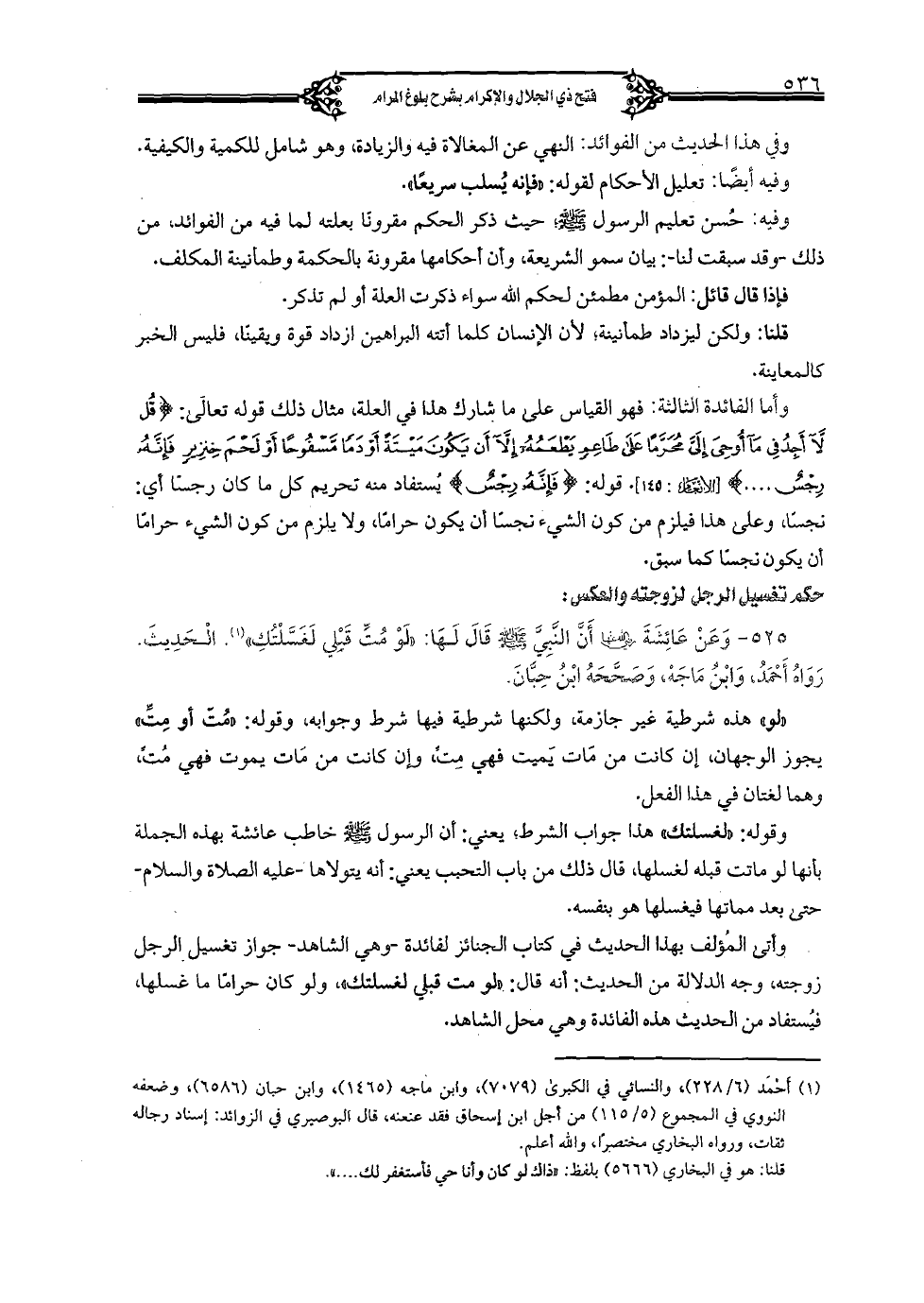 525 - وعن عائشة رضي الله عنها أن النبي (صلى الله عليه وسلم) قال لها: "لو مت قبلي لغسلتك" الحديث رواه أحمد، وأبن ماجه، وصححه ابن حبان.