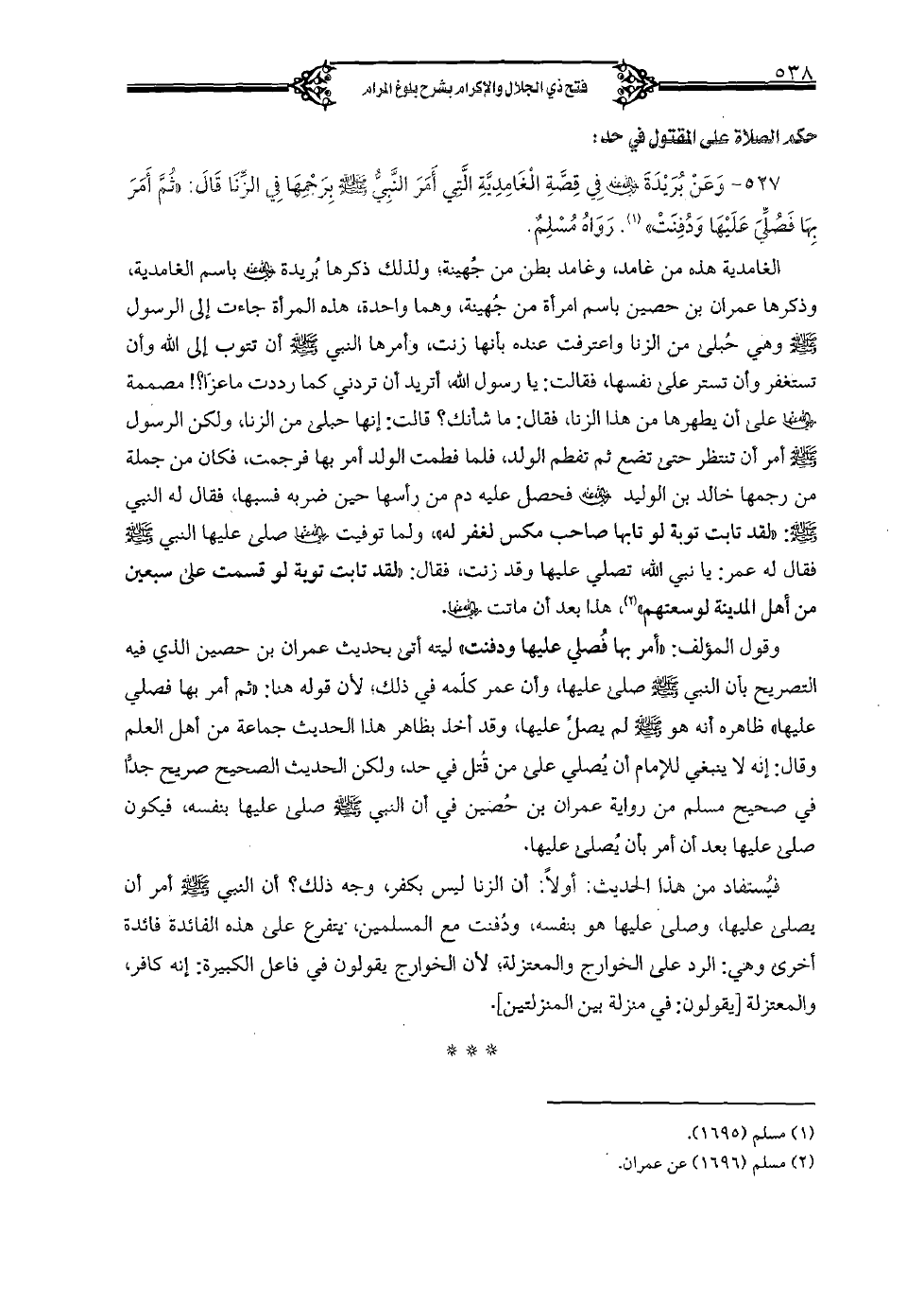 وقول المؤلف: "أمر بها فصلى عليها ودفنت" ليته أتى بحديث عمران بن حصين الذي فيه التصريح بأن النبي (صلى الله عليه وسلم) صلى عليها، وأن عمر كلمة في ذلك؛ لأن قوله هنا: "ثم أمر بها فصلى عليها" ظاهره أنه هو (صلى الله عليه وسلم) لم يصل عليها، وقد أخذ بظاهر هذا الحديث جماعة من أهل العلم وقال: إنه لا ينبغي للإمام أن يصلى على من قتل في حد، ولكن الحديث الصحيح صريح جدًا في صحيح مسلم من رواية عمران بن حصين في أن النبي (صلى الله عليه وسلم) صلى عليها بنفسه، فيكون صلى عليها بعد أن أمر بأن يصلى عليها.