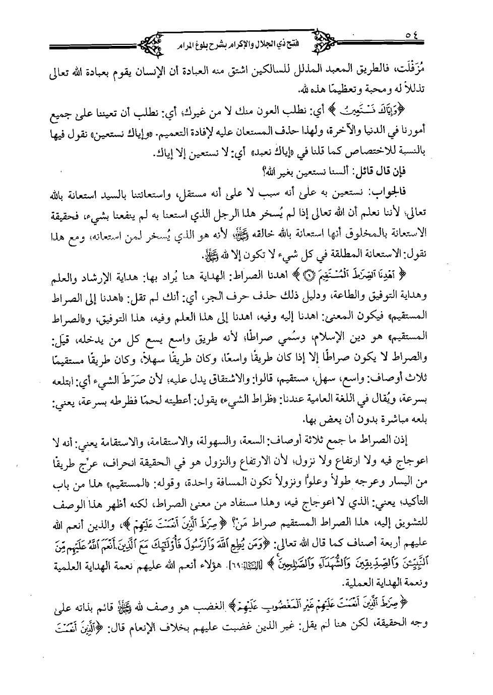 إذن الصراط ما جمع ثلاثة أوصاف: السعة، والسهولة، والاستقامة، والاستقامة يعني: أنه لا اعوجاج فيه ولا ارتفاع ولا نزول؛ لأن الارتفاع والنزول هو في الحقيقة انحراف، عرج طريقًا من اليسار وعرجه طولًا وعلوًّا ونزولًا تكون المسافة واحدة، وقوله: "المستقيم" هذا من باب التأكيد؛ يعني: الذي لا اعوجاج فيه، وهذا مستفاد من معنى الصراط، لكنه أظهر هذا الوصف للتشويق إليه، هذا الصراط المستقيم صراط مَنْ؟ {صراط الذين أنعمت عليهم}، والذين أنعم الله عليهم أربعة أصناف كما قال الله تعالى: {ومن يطع الله والرسول فأولئك مع الذين أنعم الله عليهم من النبيين والصديقين والشهداء والصالحين} [النساء: 69]. هؤلاء أنعم الله عليهم نعمة الهداية العلمية ونعمة الهداية العملية.