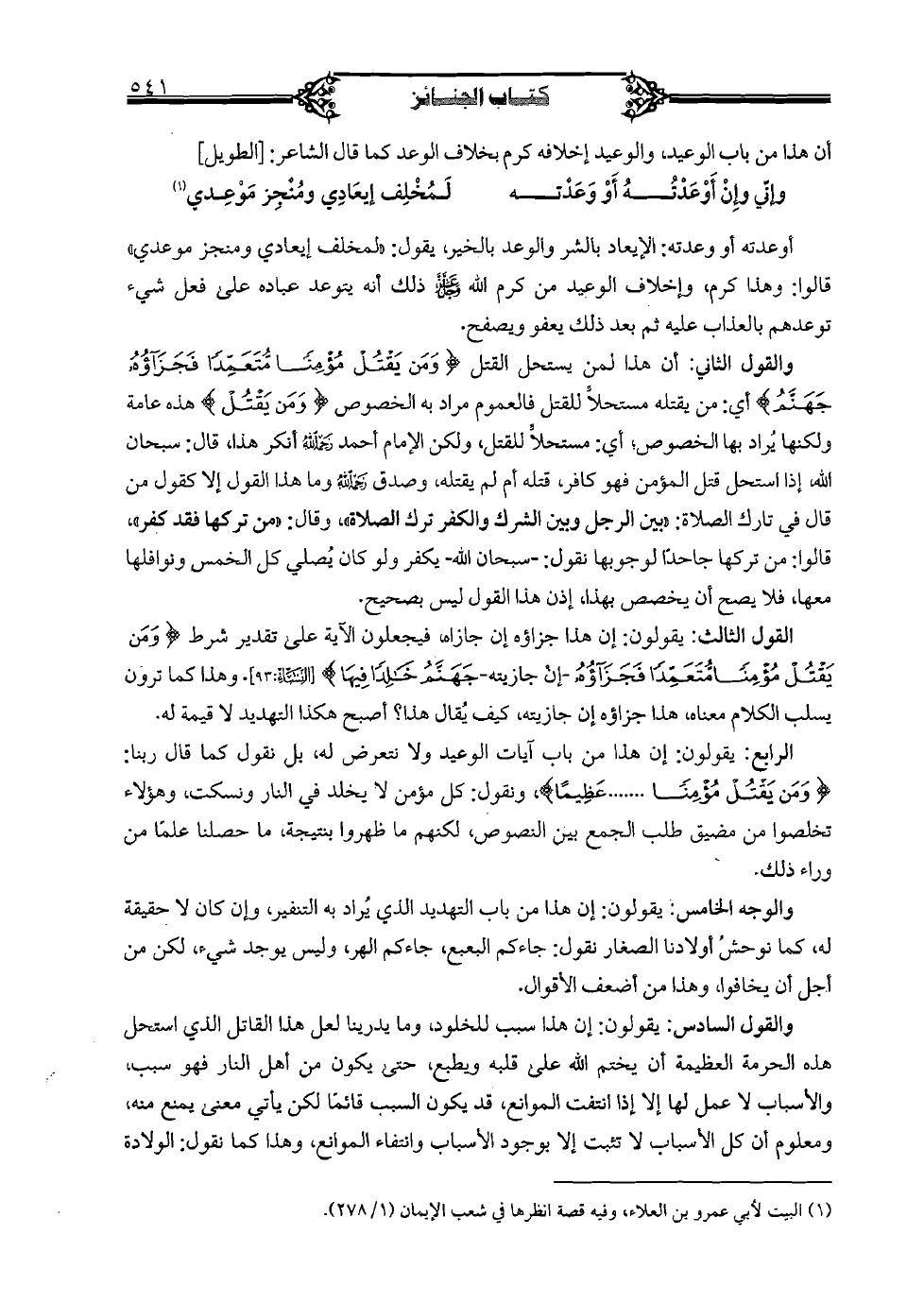 الرابع: يقولون: إن هذا من باب آيات الوعيد ولا نتعرض له، بل نقول كما قال ربنا: {ومن يقتل مؤمنًا ... عظيمًا}، ونقول: كل مؤمن لا يخلد في النار ونسكت، وهؤلاء تخلصوا من مضيق طلب الجمع بين النصوص، لكنهم ما ظهروا بنتيجة، ما حصلنا علمًا من وراء ذلك.