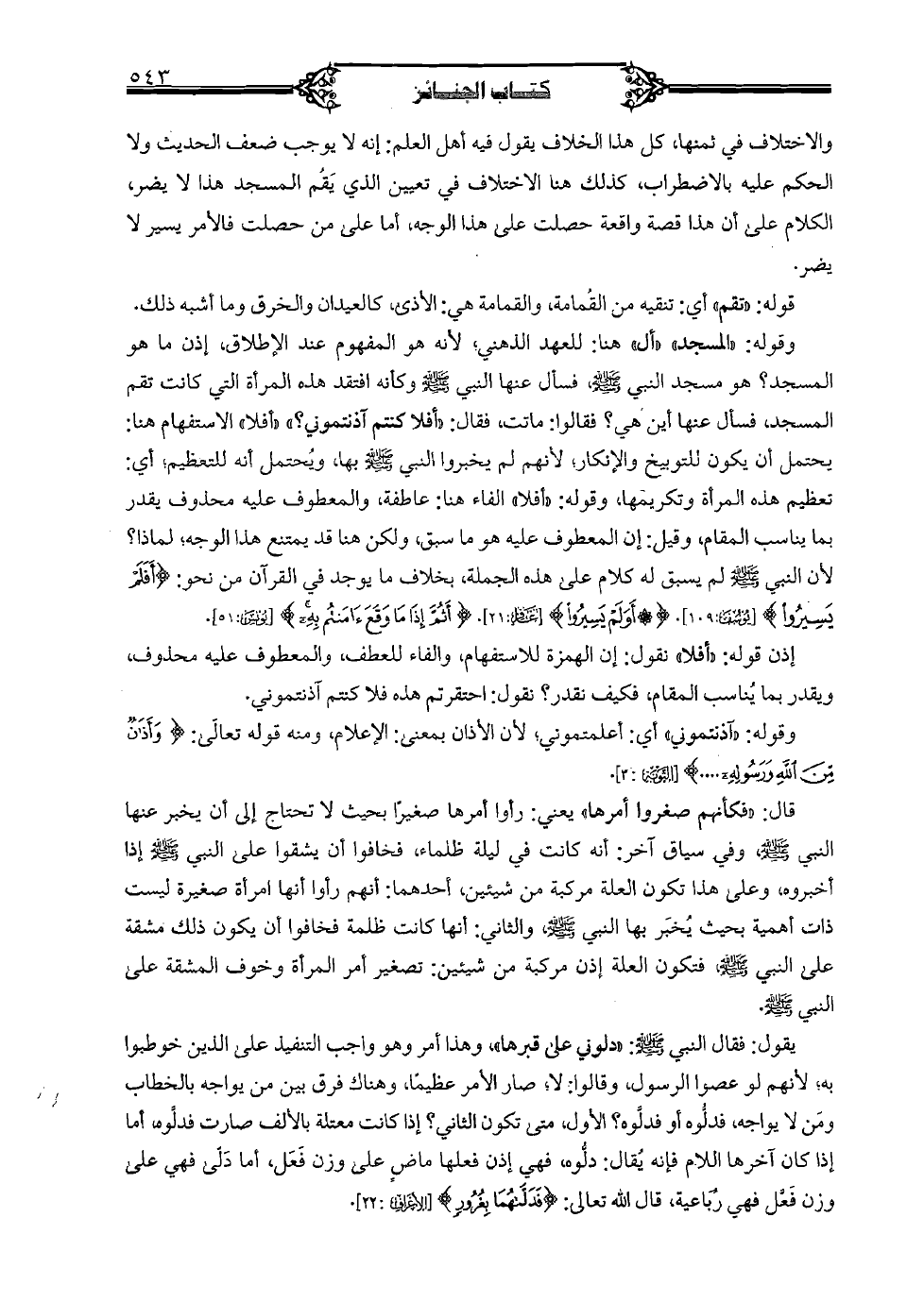 وقوله: "المسجد" "أل" هنا: للعهد الذهني، لأنه هو المفهوم عند الإطلاق، إذن ما هو المسجد؟ هو مسجد النبي (صلى الله عليه وسلم) فسأل عنها النبي (صلى الله عليه وسلم) وكأنه أتفقد هذه المرأة التي كانت تقم المسجد، فسأل عنها أين هي؟ فقالوا: ماتت، فقال: "أفلا كنتم آذنتموني؟ " "أفلا" الاستفهام هنا: يحتمل أن يكون للتوبيخ والإنكار، لأنهم لا يخبروا النبي (صلى الله عليه وسلم) بها، ويحتمل أنه للتعظيم، أي: تعظيم هذه المرأة وتكريمها، وقوله: "أفلا" الفاء هنا: عاطفة، والمعطوف عليه محذوف يقدر بما يناسب المقام، وقيل: إن المعطوف عليه هو ما سبق، ولكن ها قد يمتنع هذا الوجه؛ لماذا؟ لأن النبي (صلى الله علي وسلم) لم يسبق له كلام على هذه الجملة، بخلاف ما يوجد في القرآن من نحو: {أفلم يسيروا} [يوسف 109] {أو لم يسيروا} [غافر: 21] {أثم إذا وقع أمنتم به} [يوسف: 51] ,