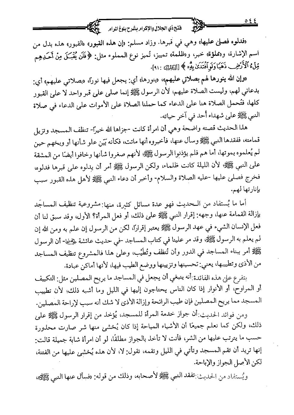 أما ما يستفاد من الحديث فهو عدة مسائل كثيرة، منها: مشروعية تنظيف المساجد بإزالة القمامة عنها، وجهه: إقرار النبي (صلى الله عليه وسلم) على ذلك، أو فعل المرأة؟ الأول، وقد سبق لنا أن فعل الإنسان الشيء في عهد الرسول (صلى الله عليه وسلم) يعتبر إقراراً، لكن من الرسول إن علم به ومن الله إن لم يعلم به الرسول (صلى الله عليه وسلم)، وقد مر علينا في كتاب المساجد- في حديث عائشة (رضي الله عنها- أن الرسول (صلى الله عليه ولسم) أمر ببناء المساجد في الدور وأن تنظف وتطيب، وعلى هذا فالمشروع تنظيف المساجد من الأذى وتطيبيها، يعني: تحسينها وتزيينها ووضع الطيب فيها؛ لأنها أماكن عبادة.