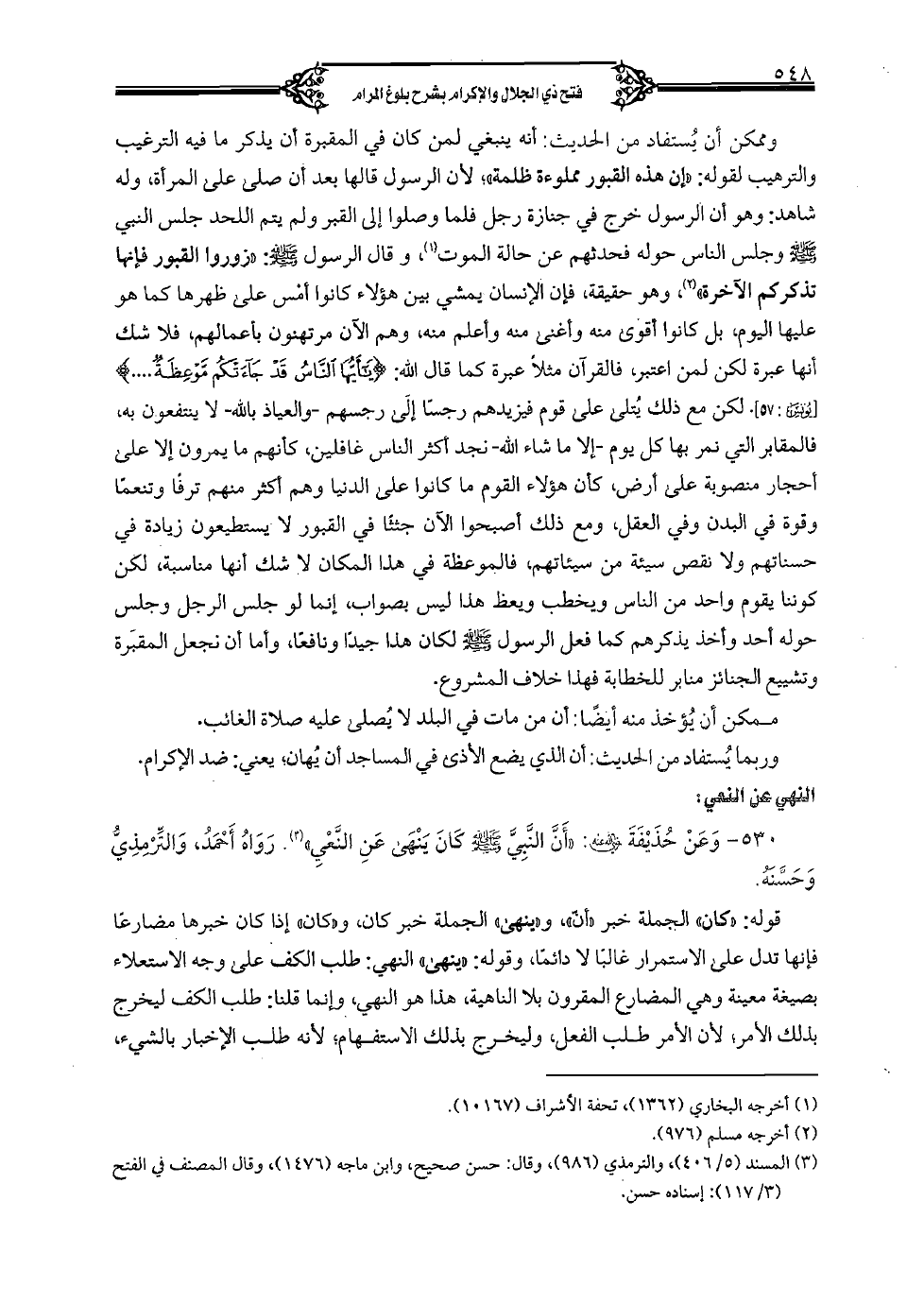 530 - وعن حذيفة (رضي الله عنه): "أن النبي (صلى الله عليه وسلم) كان ينهي عن النعي"، رواه أحمد، والترمذي وحسنه.