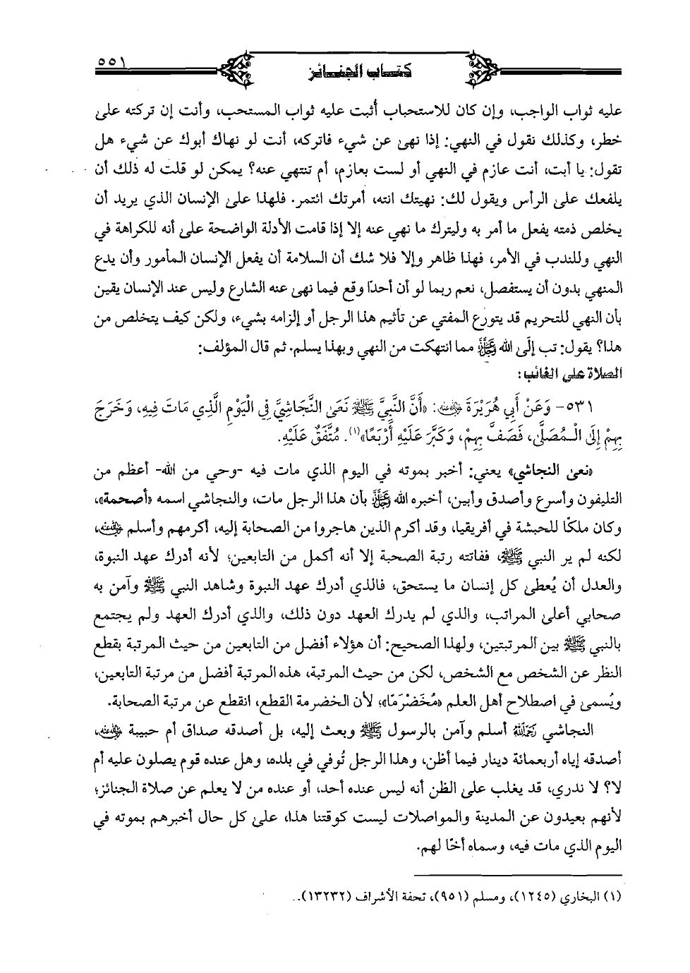 "نعى النجاشي" يعني: أخبر بموته في اليوم الذي مات فهي - وحى من الله- أعظم من التليفون وأسرع وأصدق وأبين، أخبره الله (عز وجل) بأن هذا الرجل مات، والنجاشي اسمه "اصحمة"، وكان ملكًا للحبشة في أفريقيا، وقد أكرم الذين هاجروا من الصحابة إليه، أكرهم وأسلم (رضي الله عنه)، لكنه لم ير النبي (صلى الله عليه وسلم) ففاتته رتبة الصحبة إلا أنه أكمل من التابعين، لأنه أدرك عهد النبوة، والعدل أن يعطي كل إنسان ما يستحق، فالذي أدرك عهد النبوة وشاهد النبي (صلى الله عليه وسلم) وآمن به صحابي أعلى المراتب، والذي لم يدرك العهد دون ذلك، والذي أدرك العهد ولم يجتمع بالنبي (صلى الله عليه وسلم) بين المرتبتين، ولهذا الصحيح أن هؤلاء أفضل من التابعين من حيث المرتبة يقطع النظر عن الشخص مع الشخص، لكن من حيث المرتبة، هذه المرتبة أفضل من مرتبة التابعين، ويسمى في اصطلاح أهل العلم "مخضرمًا" لأن الخضرمة القطع، انقطع عن مرتبة الصحابة.
