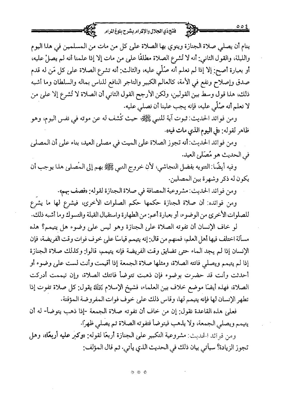 لو خاف الإنسان أن تفوته الصلاة على الجنازة وهو ليس على وضوء هل يتيمم؟ هذا مسألة اختلف فيها أهل العلم، فمنهم من قال: إنه يتيم قياسًا على خوف فوات وقت الفريضة، فإن الإنسان إذا لم يجد الماء حتى تضايق وقت الفريضة فإنه يتيمم، قالوا: وكذلك صلاة الجنازة إذا لم يتيمم ويصلى فاتته الصلاة، ومثلها صلاة الجمعة إذا أقيمت وأنت لست على وضوء أو أحدثت وأنت قد حضرت بوضوء فإن ذهبت تتوضأ فاتتك الصلاة، وإن تيممت أدركت الصلاة فهذه أيضًا موضع خلاف بين العلماء، فشيخ الإسلام (رحمه الله) يقول: كل صلاة تفوت إذا تطهر الإنسان لها فإنه يتيم لها، وقاس ذلك على خوف فوات المفروضة المؤقتة.