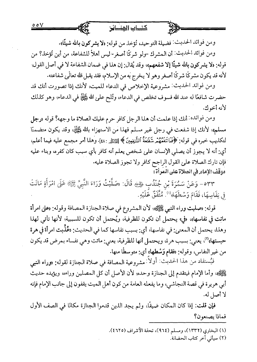 533 - وعن سمرة بن جندب (رضي الله عنه) قال: "صليت وراء النبي (صلى الله عليه وسلم) على امرأة ماتت في نفاسها، فقام وسطها" متفق عليه.