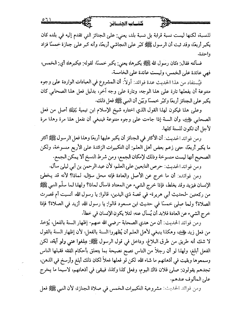 فيستفاد من هذا الحديث عدة فوائد: أولاً: أن المشروع في العبادات الواردة على وجوه متنوعة أن يفعلها تارة على هذا الوجه، وتارة على وجه آخر، بدليل فعل هذا الصحابي كان يكبر على الجنائز أربعًا وكبر خمسًا وبين أن النبي (صلى الله عليه وسلم) فعل ذلك.