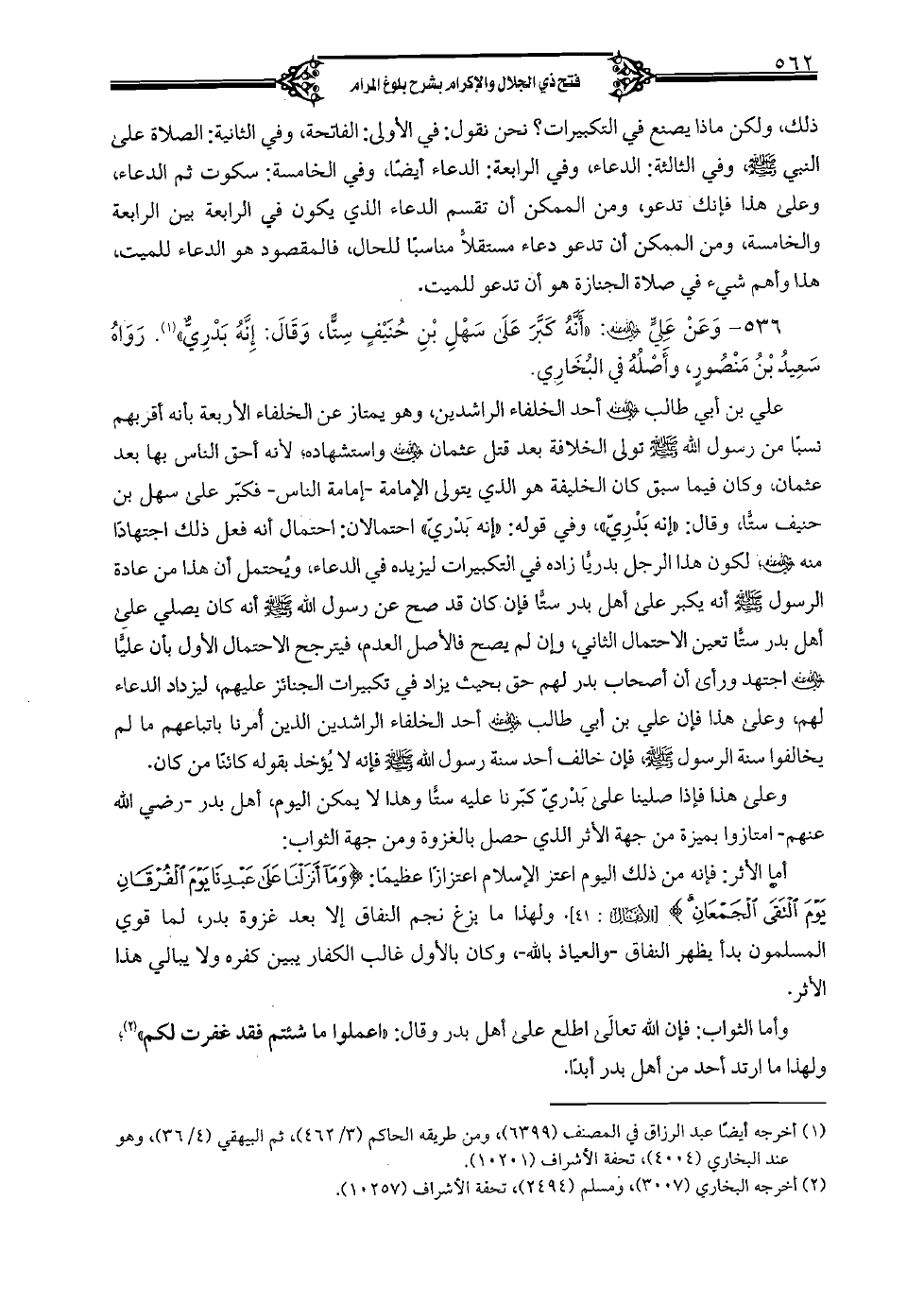 536 - وعن علي (رضي الله عنه): "انه كبر على سهل بن حنيف ستًا، وقال: إنه بدري"، رواه سعيد بن منصور، وأصله في البخاري.