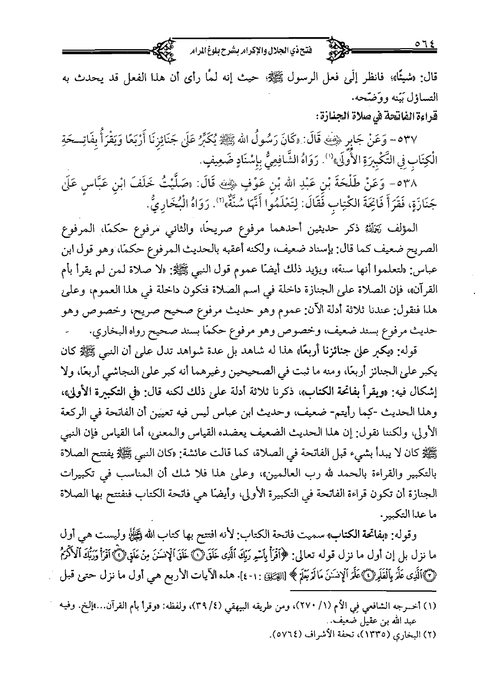 المؤلف (رحمه الله) ذكر حديثين أحدهما مرفوع صريحًا، والثاني مرفوع حكمًا، المرفوع الصريح ضعيف كما قال: بإسناد ضعيف، ولكنه أعقبه بالحديث المرفوع حكمًا، وهو قول ابن عباس: "لتعلموا أنها سنة" ويؤيد ذلك أيضًا عموم قول النبي (صلى الله عليه وسلم): "لا صلاة لمن لم يقرأ بأم القرآن: فإن الصلاة على الجنازة داخله في اسم الصلاة فتكون داخله في هذا العموم، وعلى هذا فنقول: عندنا ثلاثة أدلة الآن: عموم وهو حديث مرفوع صحيح صريح، وخصوص وهو حديث مرفوع بسند ضعيف، وخصوص وهو مرفوع حكمًا بسند صحيح رواه البخاري.