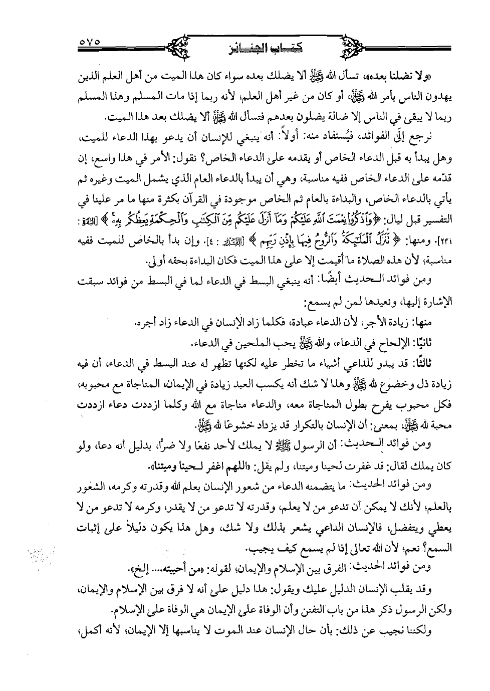 نرجع إلى الفوائد، فيستفاد منه: أولًا: أنه ينبغي للإنسان أن يدعو بهذا الدعاء للميت؛ وهل يبدأ به قبل الدعاء الخاص أو يقدمه على الدعاء الخاص؟ نقول: الأمر في هذا واسع، إن قدّمه على الدعاء الخاص فيه مناسبة، وهي أن يبدأ بالدعاء العام الذي يشمل الميت وغيره ثم يأتي بالدعاء الخاص، والبداءة بالعام ثم الخاص موجدة في القرآن بكثرة منها ما مر علينا في التفسير قبل ليال: {واذكروا نعمت الله عليكم وما أنزل عليكم وما أنزل عليكم من الكتاب والحكمة يعظكم به} [البقرة: 231]؛ لأن هذه الصلاة ما أقيمت إلا على هذا الميت فكان البداءة بحقه أولى.
