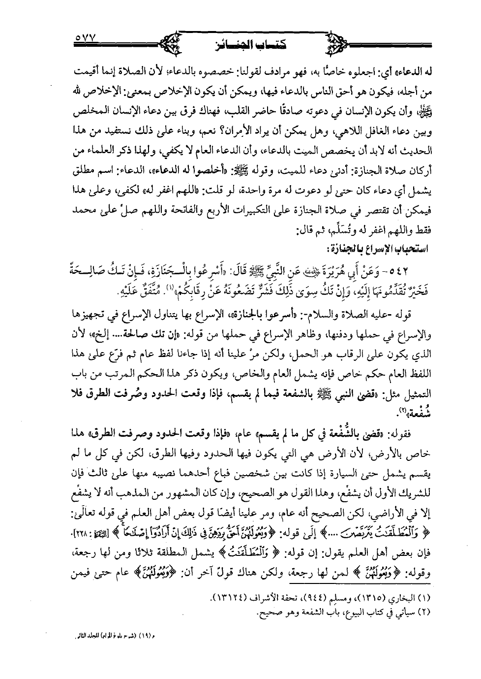 قوله- عليه الصلاة والسلام-: "وأسرعوا بالجنازة"، الإسراع بها يتناول الإسراع في تجهيزها والإسراع في حملها ودفنها، وظاهر الإسراع في حملها من قوله: "إن تك صالحة .... إلخ"؛ لأن الذي يكون على الرقاب هو الحمل، ولكن مر علينا أنه إذا جاءنا لفظ عام ثم فرّع على هذا اللفظ العام حكم خاص فإنه يشمل العام والخاص، ويكون ذكر هذا الحكم المرتب من باب التمثيل مثل: "قضى النبي صلى الله عليه وسلم بالشفعة فيما لم يقسم، فإذا وقعت الحدود وصرفت الطرق فلا شفعة".