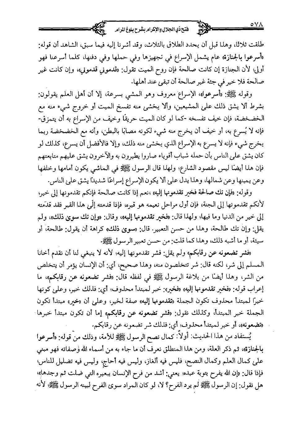 "فشر تضعونه عن رقابكم" ولم يقل: فشر تقدمونها إليه؛ لأنه لا ينبغي لنا أن نقدم أخانا المسلم إلى شر، لكنه قال: شر تتخلصون منه، وهذا صحيح، أي: أن الإنسان يؤمر أن يتخلص من الشر، وهذا أيضًا من بلاغة الرسول صلى الله عليه وسلم في لفظه قال: "فشر تضعونه عن رقابكم"، ما إعراب قوله: "فخير تقدمونها إليه" "فخير": خبر لمبتدأ محذوف؛ أي: فذلك خير، وعلى كونها خبرًا لمبتدأ محذوف تكون الجملة "تقدمونها إليه" صفة لخير، وعلى أن "خير" مبتدأ تكون الجملة خبر المبتدأ، وكذلك نقول: "فشر تضعونه عن رقابكم" إما أن تكون مبتدأ خبرها "تضعونه"، أو خبلا لمبتدأ محذوف؛ أي: فذلك شر تضعونه عن رقابكم.