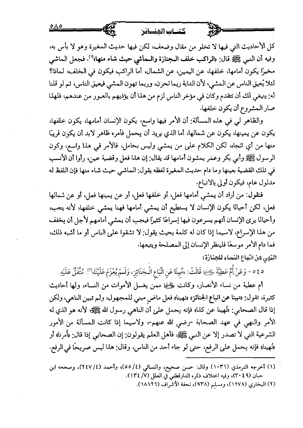 والظاهر لي في هذه المسألة: أن الأمر فيها واسع، يكون الإنسان أمامها، يكون خلفها يكون عن يمينها، يكون عن شمالها، أما الذي يريد أن يحمل فأمره ظاهر لابد أن يكون قريبًا منها من أي اتجاه، لكن الكلام على من يمشي أمامها قد يقال: إن هذا فعل وقضية عين، رأوا أن الأنسب في تلك القضية بعينها وما دام حديث المغيرة لفظه يقول: الماشي حيث شاء منها فإن اللفظ له مدلول عام، فيكون أولى بالإتباع.
