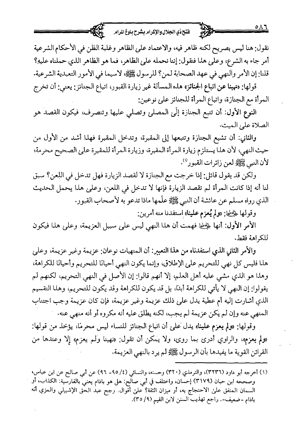 والأمر الثاني الذي استفدناه من هذا التعبير: أن المنهيات نوعان: عزيمة وغير عزيمة، وعلى هذا فليس كل نهي للتحريم على الإطلاق، وإنما يكون النهي أحيانًا للتحريم وأحيانًا للكراهة، وهذا هو الذي مشي عليه أهل العلم، إلا أنهم قالوا: إن الأصل في النهي التحريم، لكنهم لم يقولوا: إن النهي لا يأتي للكراهة أبدًا، بل قد يكون للكراهة وقد يون للتحريم، وهذا التقسيم الذي أشارت إليه أم عطية يدل على ذلك عزيمة وغير عزيمة، فإن كان عزيمة وجب اجتناب المنهي عنه وإن لم يكن عزيمة لم يجب، لكنه يطلق عليه أنه مكروه أو أنه منهي عنه.