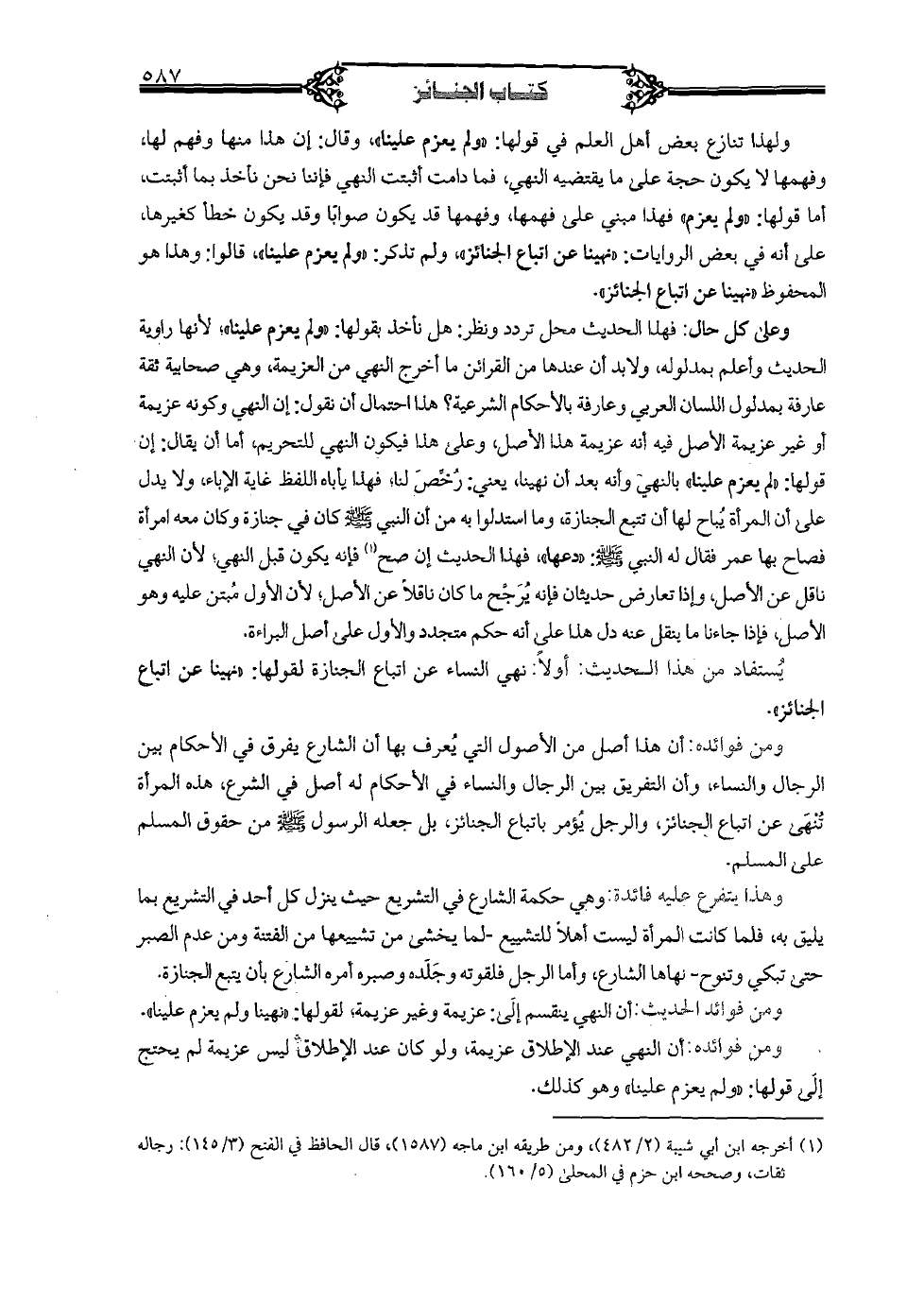 ولهذا تنازع بعض أهل العلم في قولها: "ولم يعزم علينا"، وقال: إن هذا منها وفهم لها، وفهمها لا يكون حجة على ما يقتضيه النهي، فما دامت أثبتت النهي فإننا نحن نأخذ بما أثبتت، أما قولها: "ولم يعزم" فهذا مبني على فهمها، وفهمها قد يكون صوابًا وقد يكون خطأ كغيرها، على أنه في بعض الروايات: "نهينا عن إتباع الجنائز"، ولم تذكر: "ولم يعزم علينا"، قالوا: وهذا هو المحفوظ "نهينا عن إتباع الجنائز"