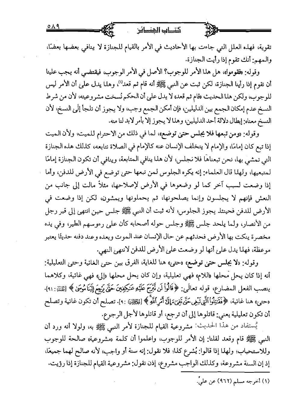 وقوله: "فقوموا"، هل هذا الأمر للوجوب؟ الأصل في الأمر الوجوب، فيقتضي أنه يجب علينا أن نقوم إذا رأينا الجنازة، لكن ثبت عن النبي صلى الله عليه وسلم أنه قام ثم قعد، وهذا يدل على أن الأمر ليس للوجوب، ولكن هذا الحديث "قام ثم قعد" لا يدل على أن الحكم نسخت مشروعيته؛ لأن من شرط النسخ عدم إمكان الجمع بين الدليلين، فإن أمكن الجمع وجب، ولا يجوز أن نلجأ إلى النسخ؛ لأن النسخ معناه: إبطال دلالة أحد الدليلين، وهذا لا يجوز إلا بأمر لابد لنا منه.