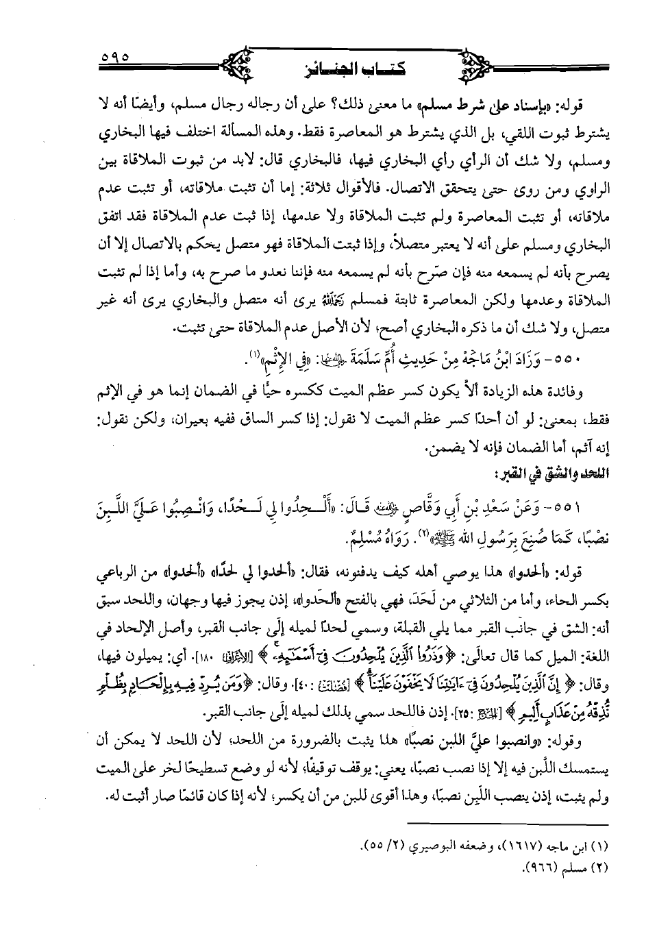 قوله: "بإسناد على شرط مسلم" ما معنى ذلك؟ على أن رجاله رجال مسلم، وأيضًا أنه لا يشترط ثبوت اللقي، بل الذي يشترط هو المعاصرة فقط. وهذه المسألة اختلف فيها البخاري ومسلم، ولا شك أن الرأي رأي البخاري فيها، فالبخاري قال: لابد من ثبوت الملاقاة بين الراوي ومن روى حتى يتحقق الاتصال. فالأقوال ثلاثة: إما أن تثبت ملاقاته، أو تثبت عدم ملاقاته، أو تثبت المعاصرة ولم تثبت الملاقاة ولا عدمها، إذا ثبت عدم الملاقاة فقد اتفق البخاري ومسلم على أنه لا يعتبر متصلًا، وإذا ثبتت الملاقاة فهو متصل يحكم بالاتصال إلا أن يصرح بأنه لم يسمعه منه فإنه صرّح بأنه لم يسمعه منه فإننا نعدو ما صرح به، وأما إذا لم تثبت الملاقاة وعدمها ولكن المعاصرة ثابتة فمسلم رحمه الله يرى أنه متصل والبخاري يرى أنه غير متصل، ولا شك أن ما ذكره البخاري أصح؛ لأن الأصل عدم الملاقاة حتى تثبت.